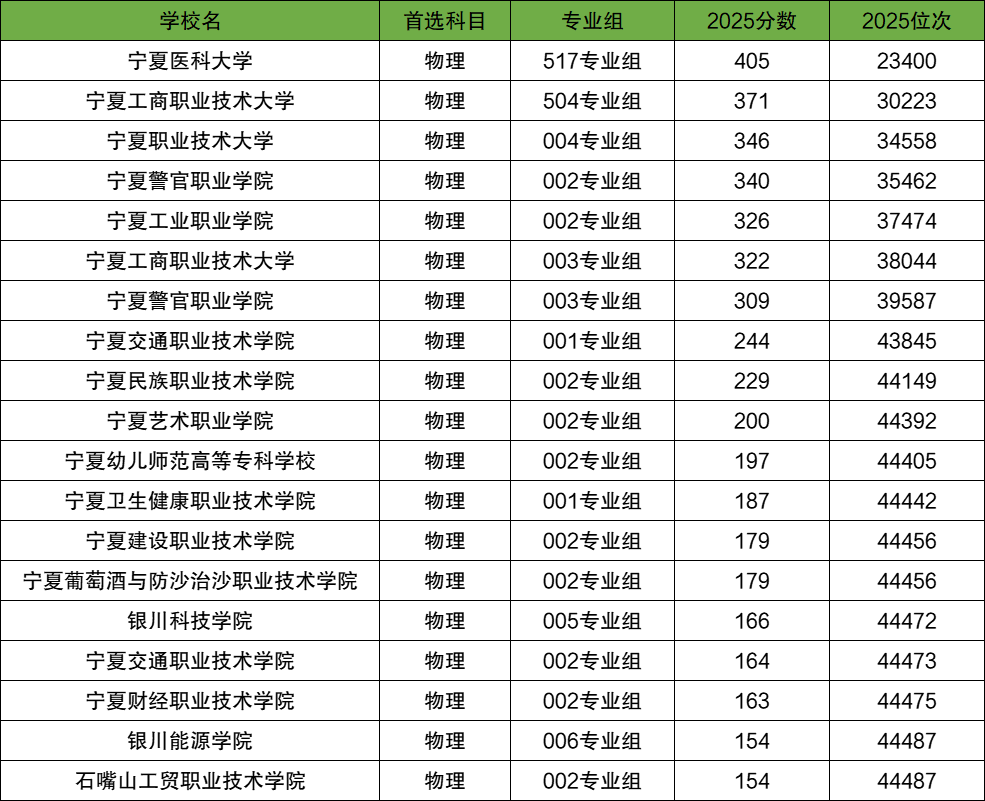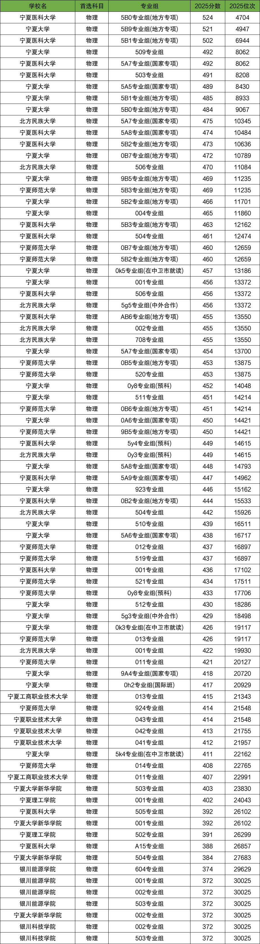 1、宁夏2025各校录取分数线排名(本科物理类)