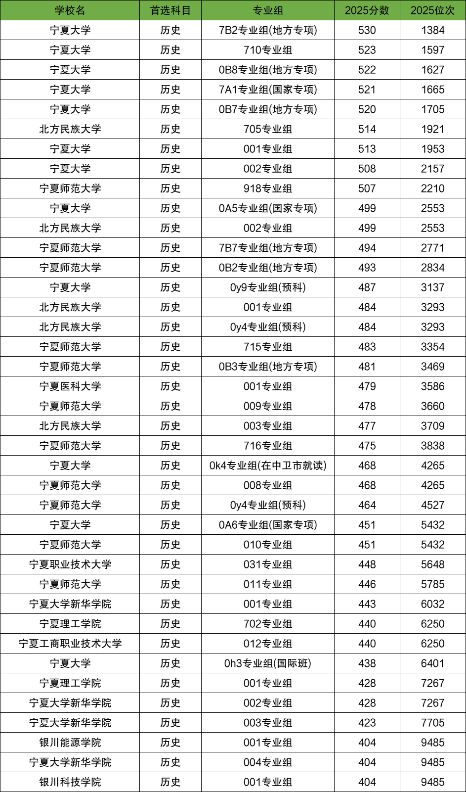 2、宁夏2025各校录取分数线排名(本科历史类)