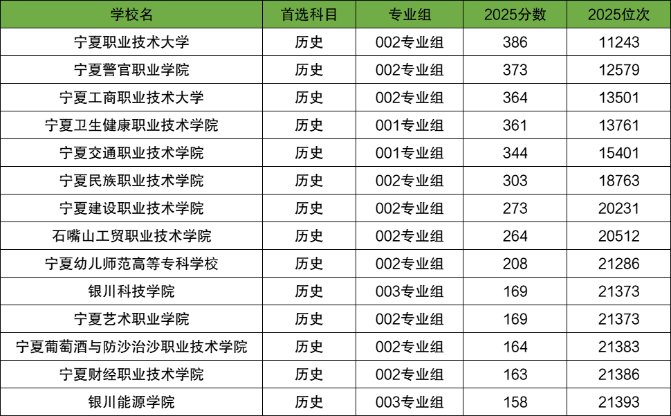 4、宁夏2025各校录取分数线排名(专科历史类)