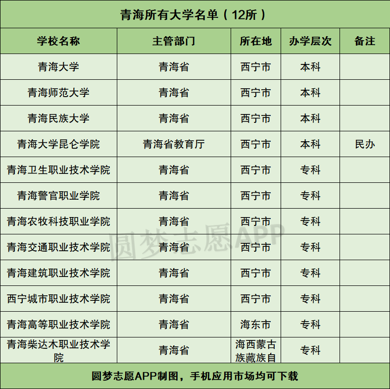 根据教育部发布的《2023年全国高等学校名单》可知,青海省一共有12所大学。其中本科大学4所;专科大学8所。
