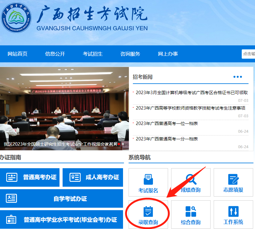 考生登录广西招生考试院官网,在首页找到“系统导航”,点击“录取查询”,即可查询高考录取状态。