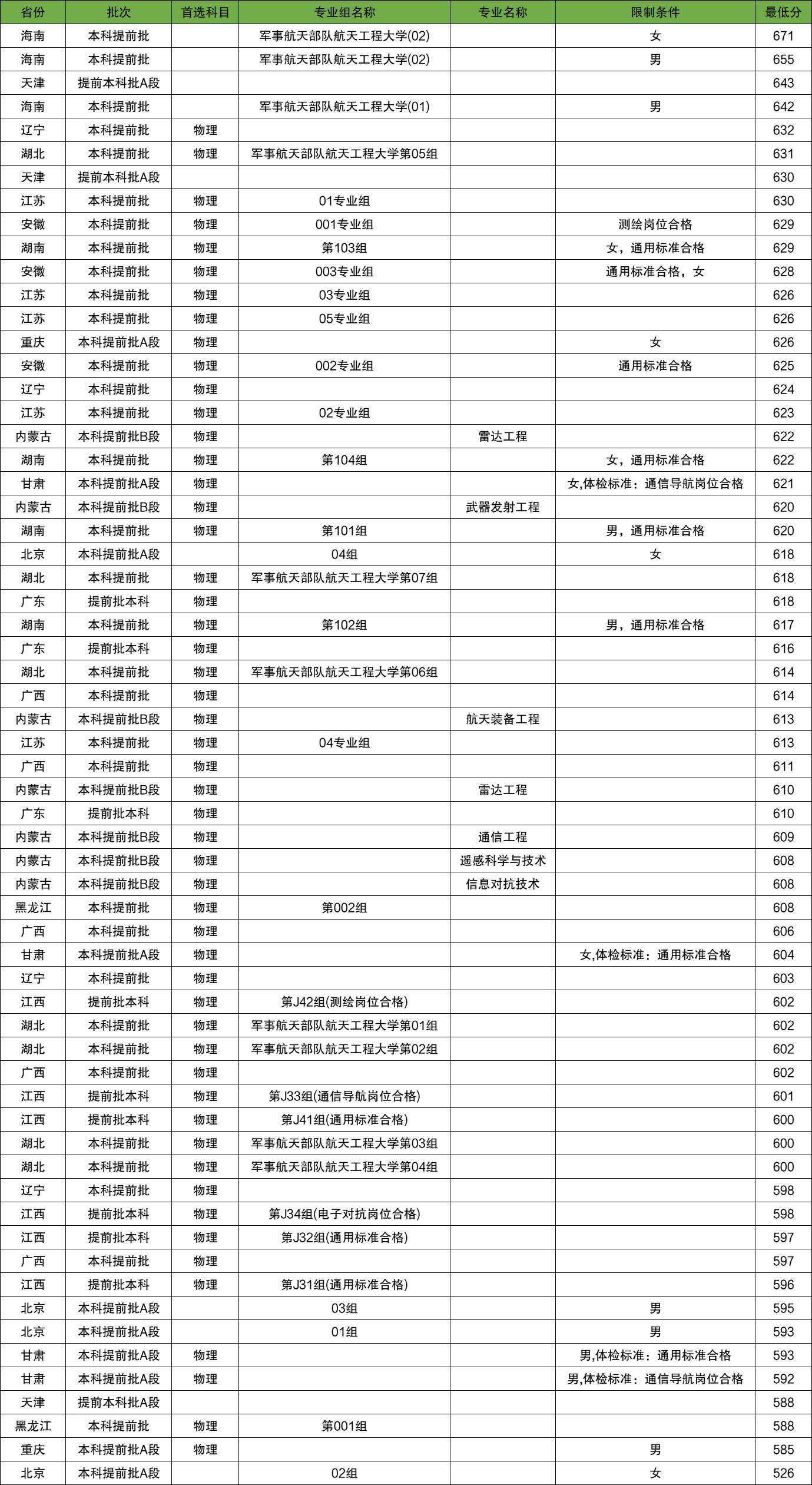 2025年军事航天部队航天工程大学提前批录取分数线是526分到671分,录取最低在北京02组、录取最高在海南02组。