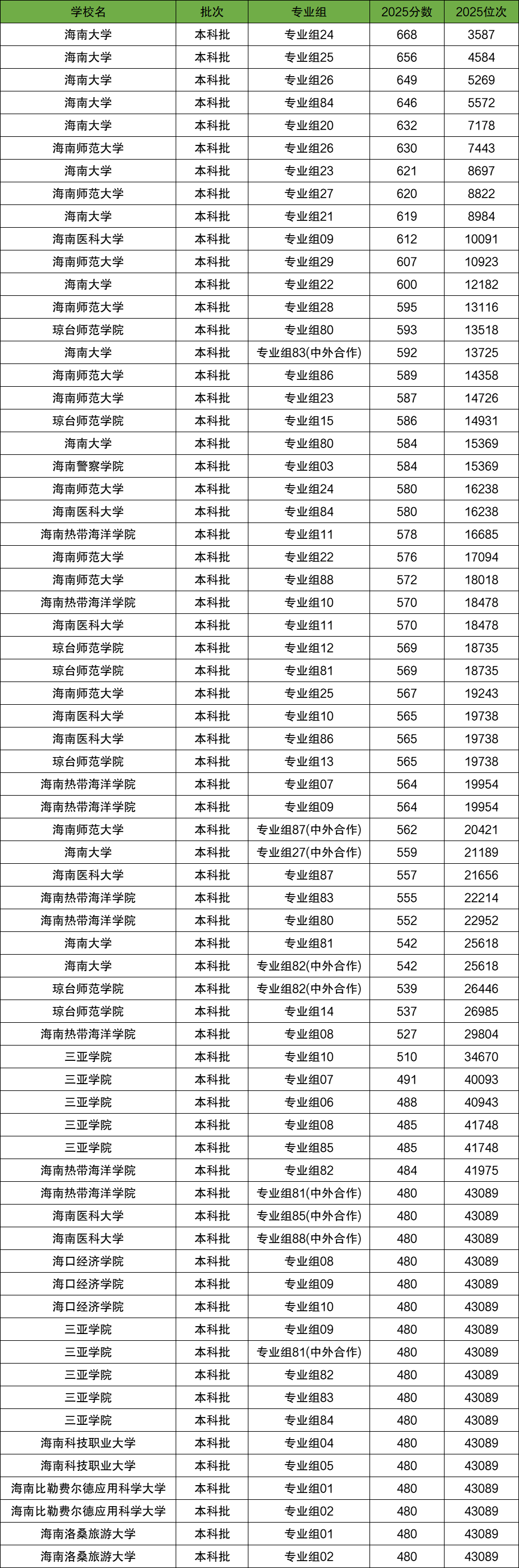 根据2025年高考海南一分一段表可知,480分对应的名次为43089,只有高考成绩考进了海南这么多名的考生才有机会被本科大学录取。