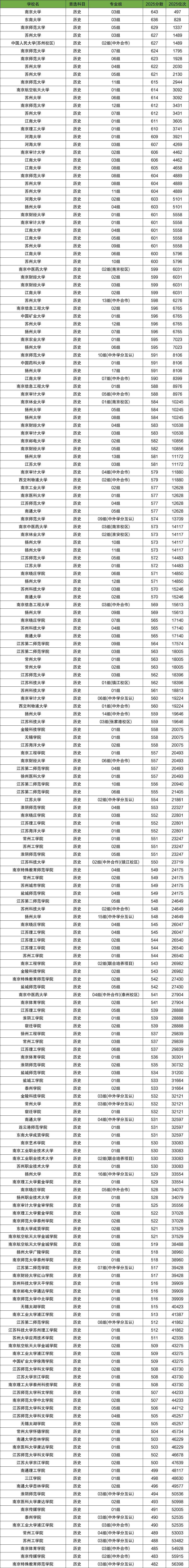 2、江苏2025各校录取分数线排名(历史类本科批)