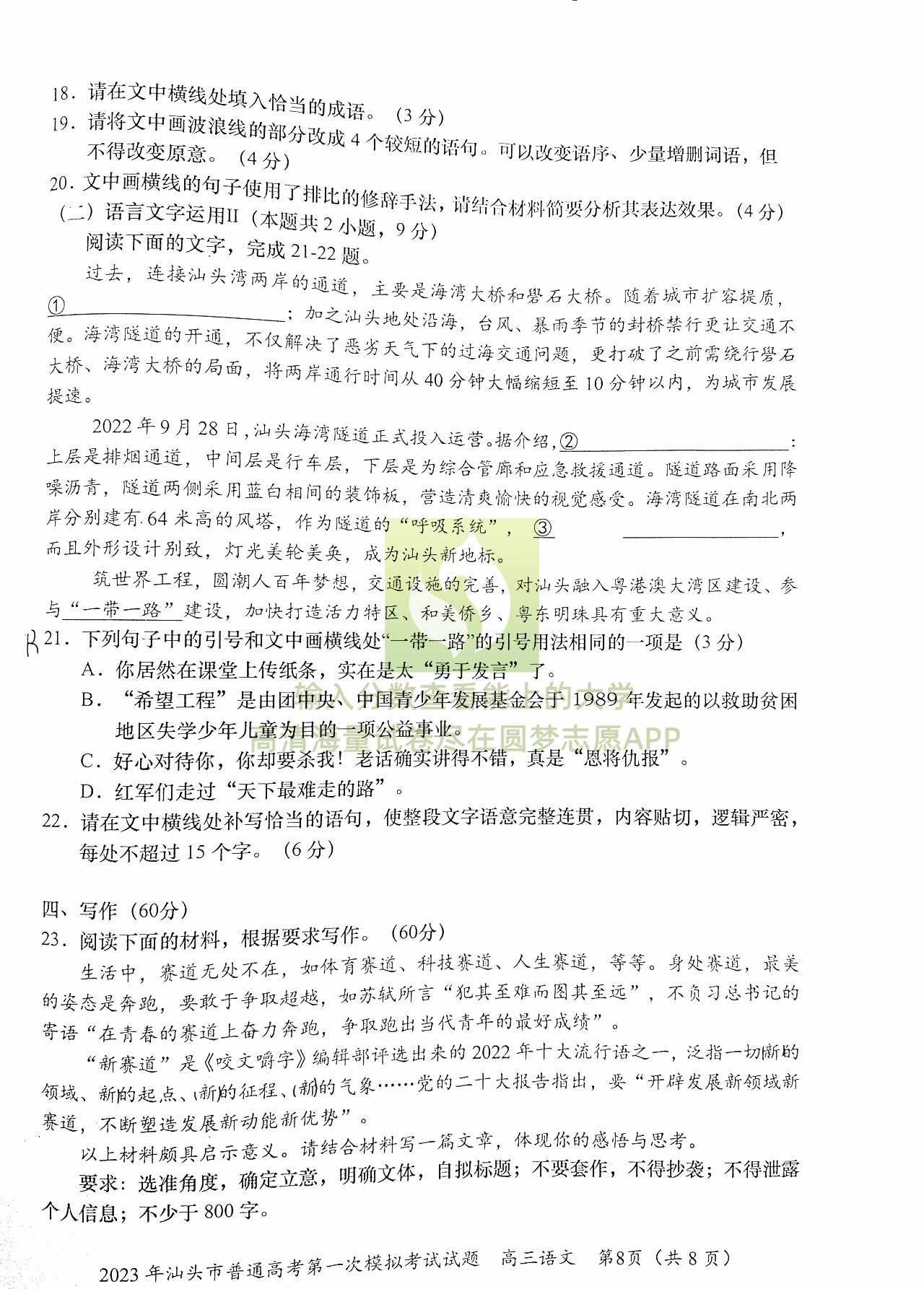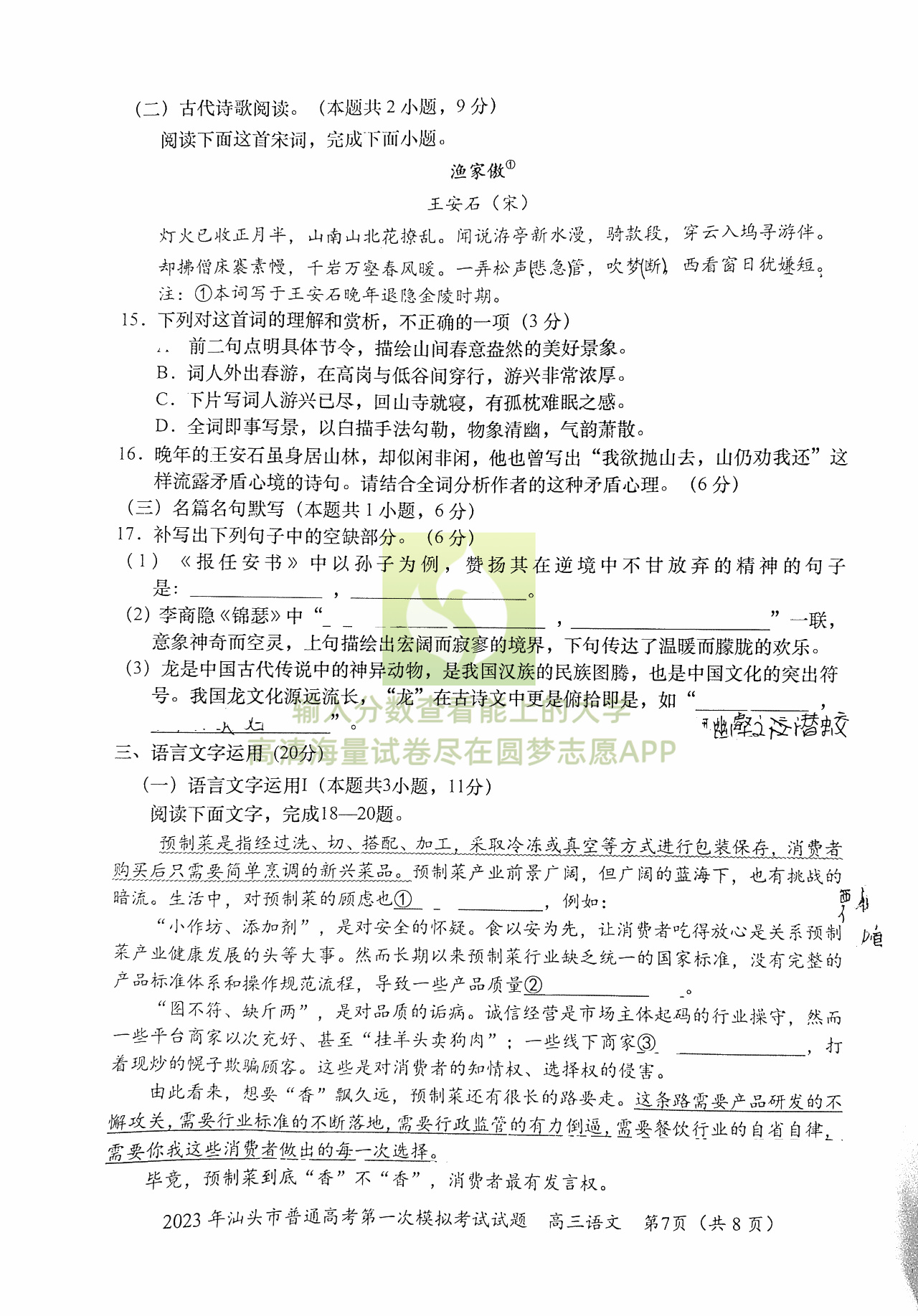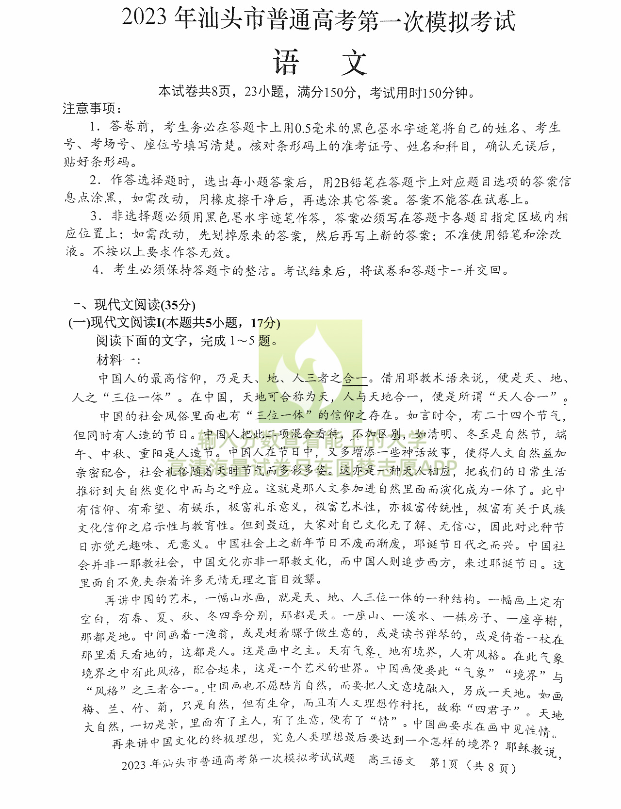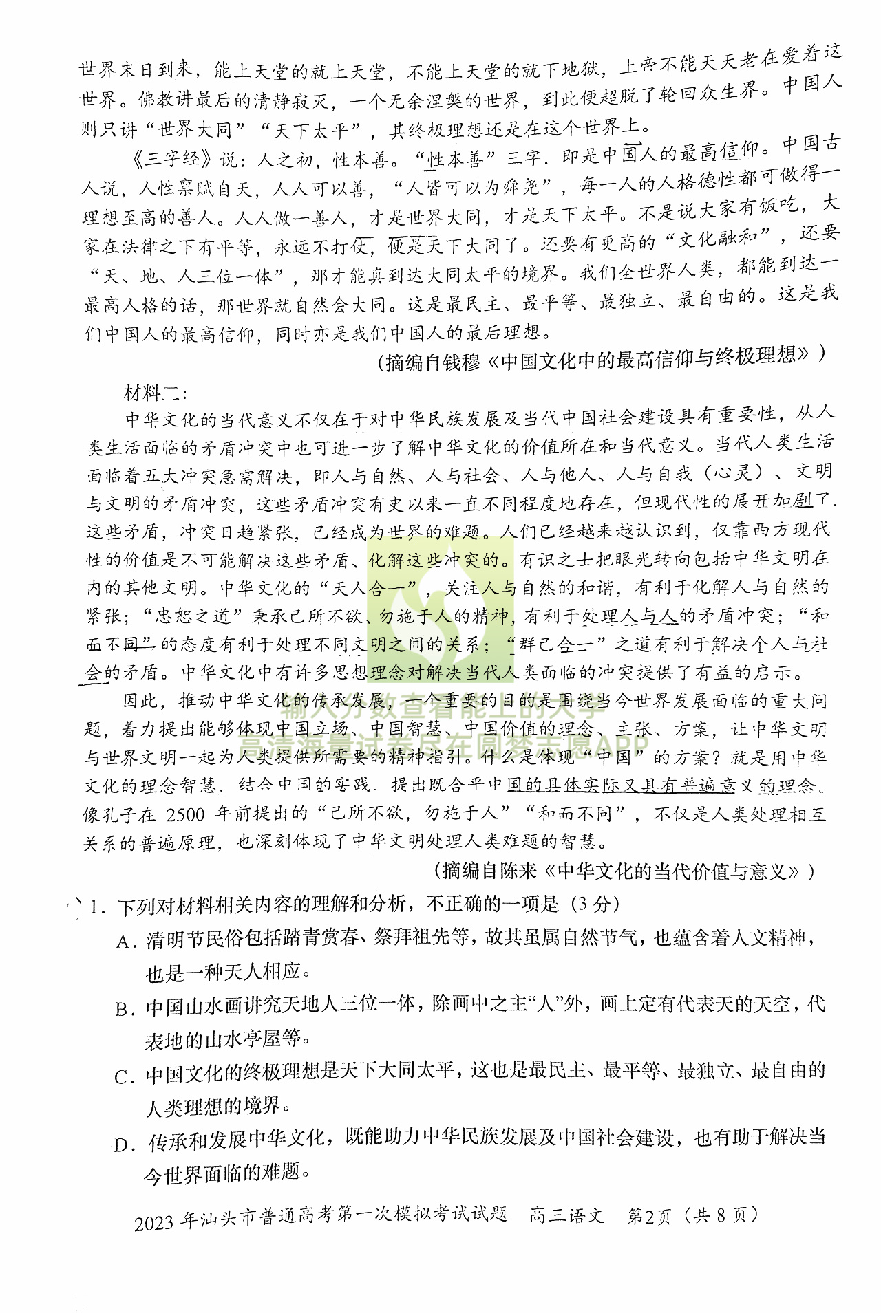一.2023汕头一模语文试卷真题及答案解析汇总