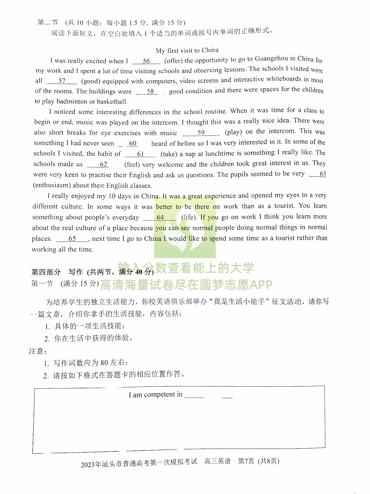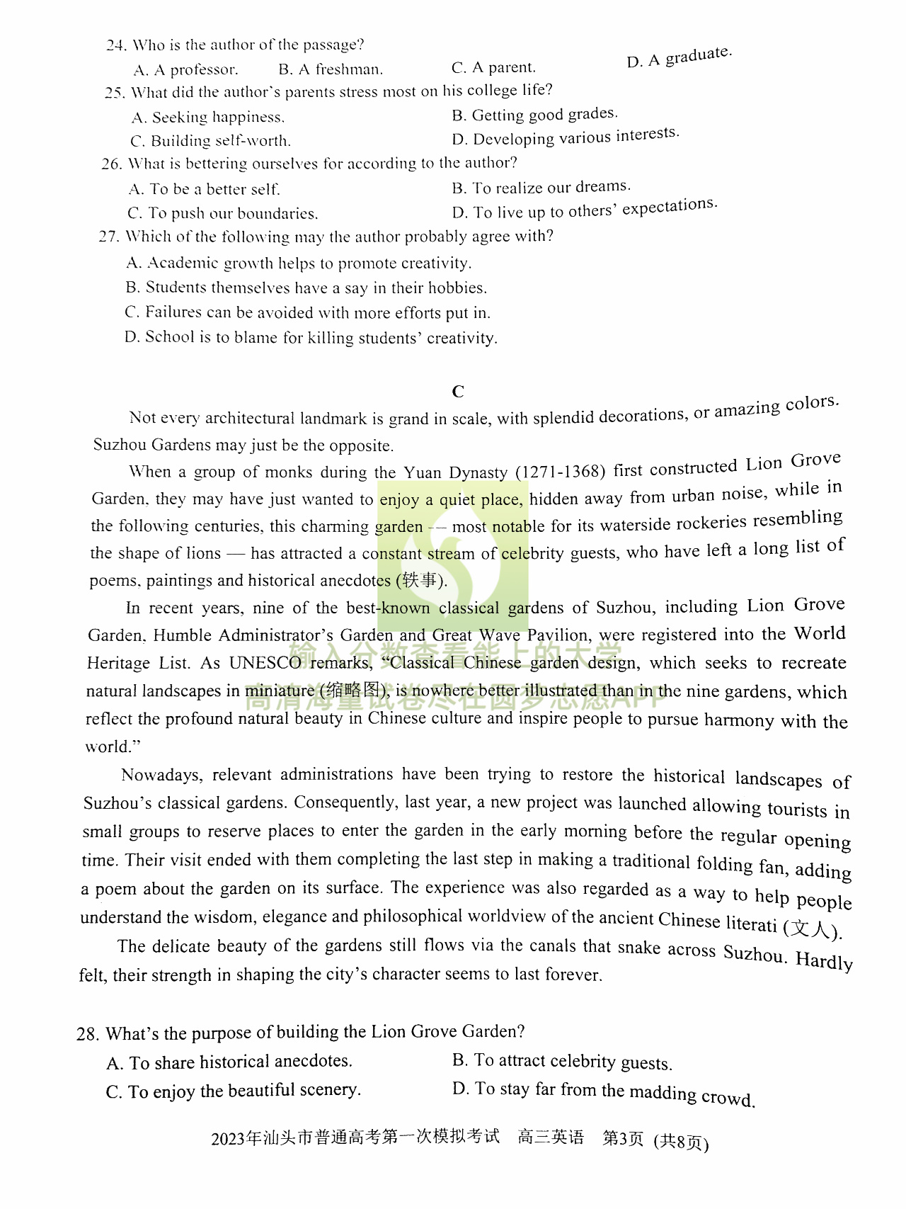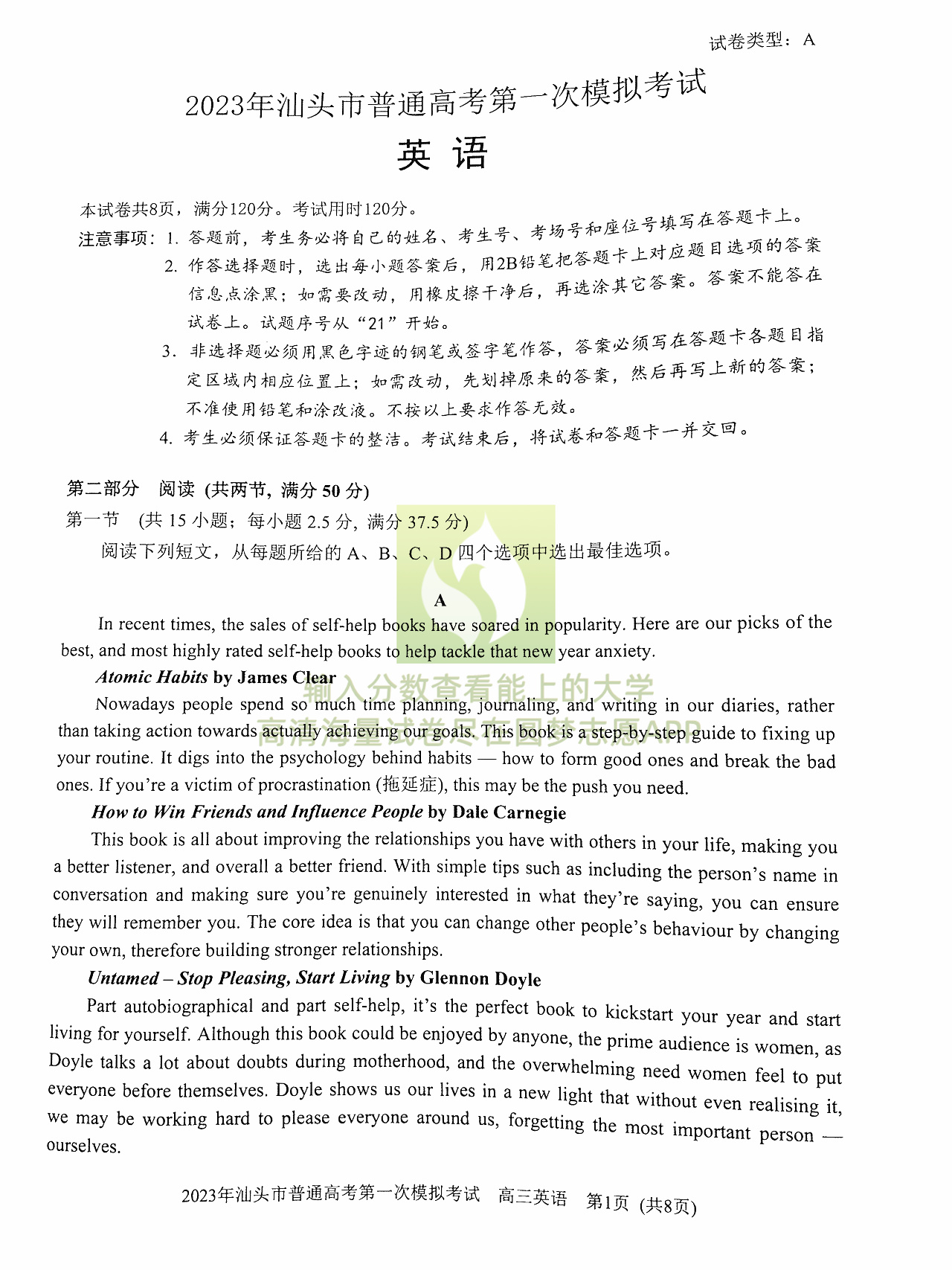 三.2023汕头一模英语试卷真题及答案解析汇总