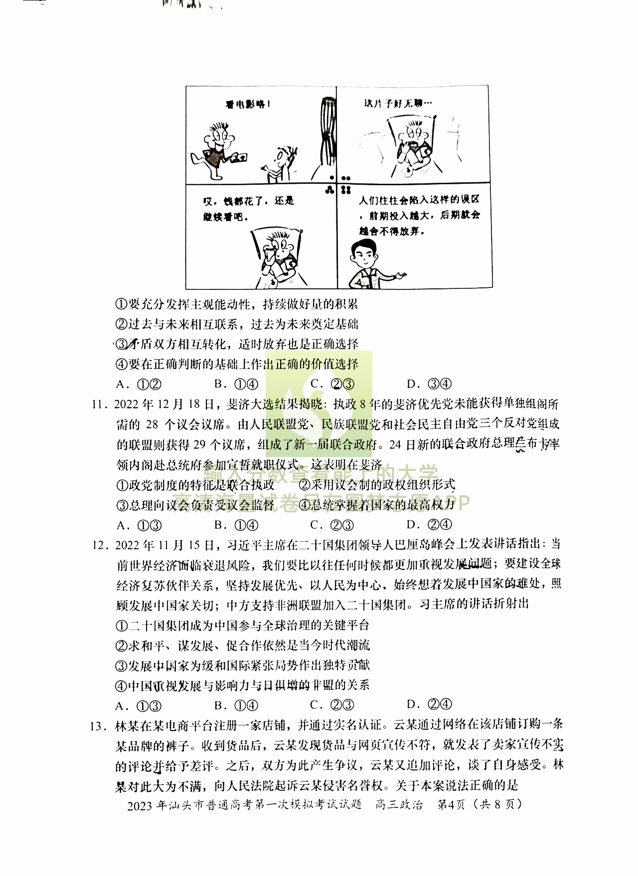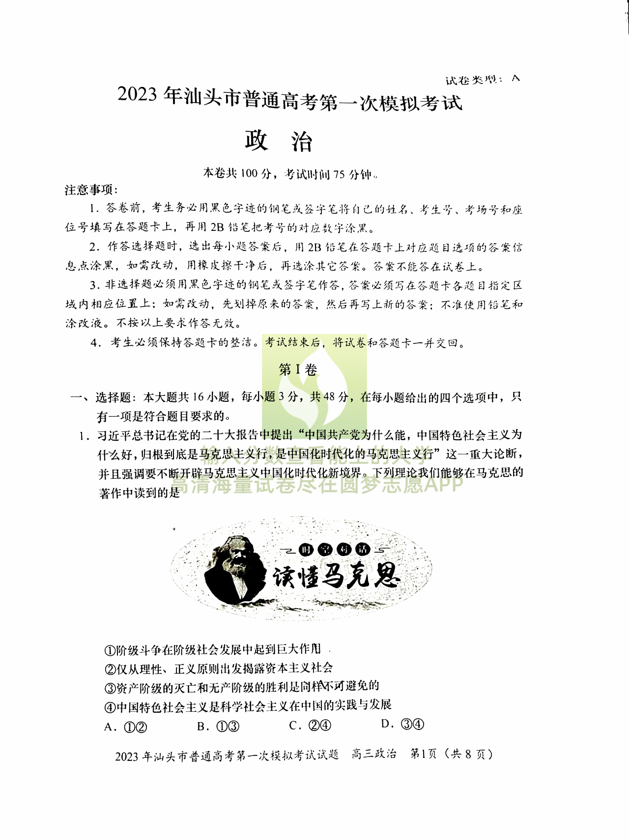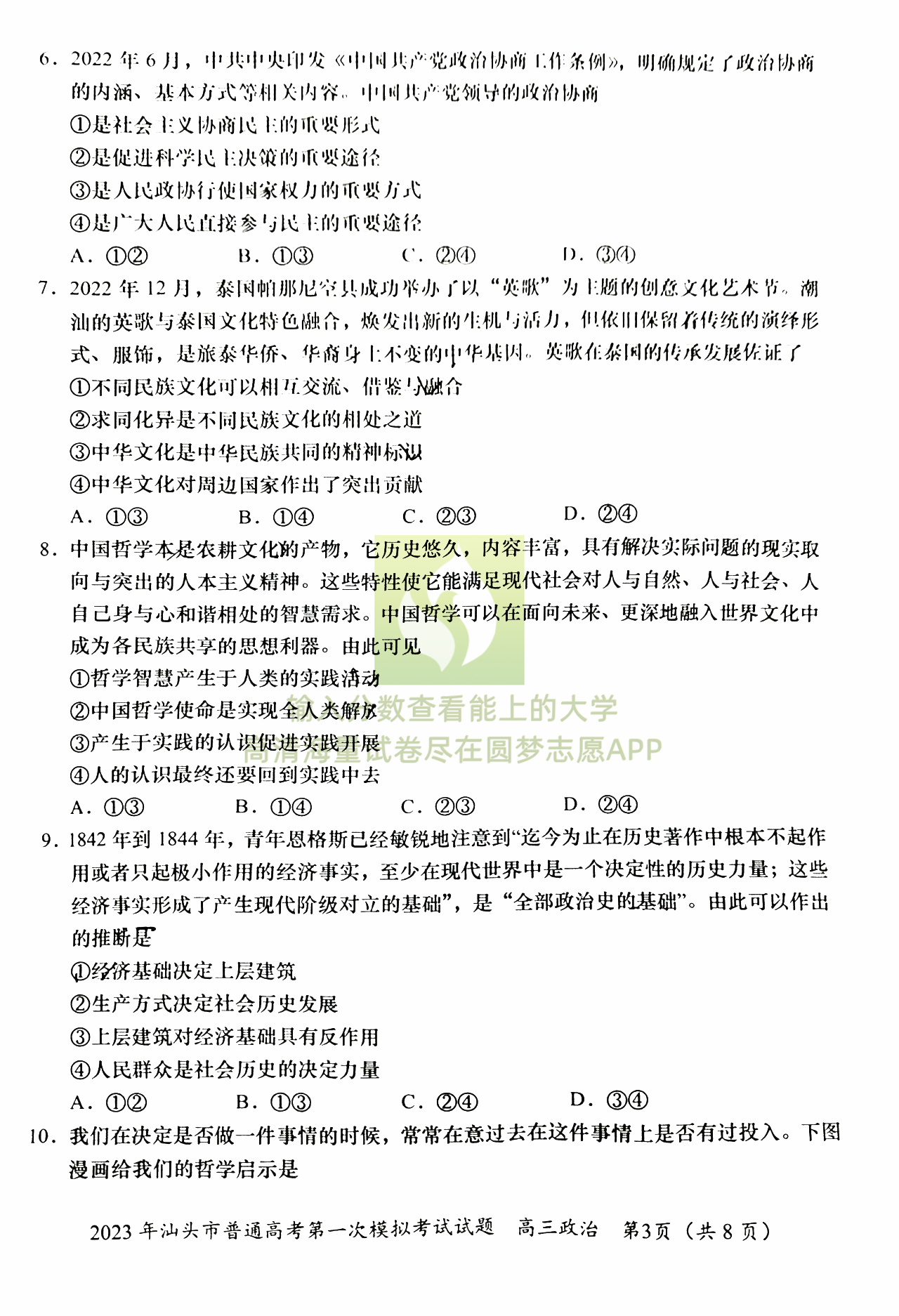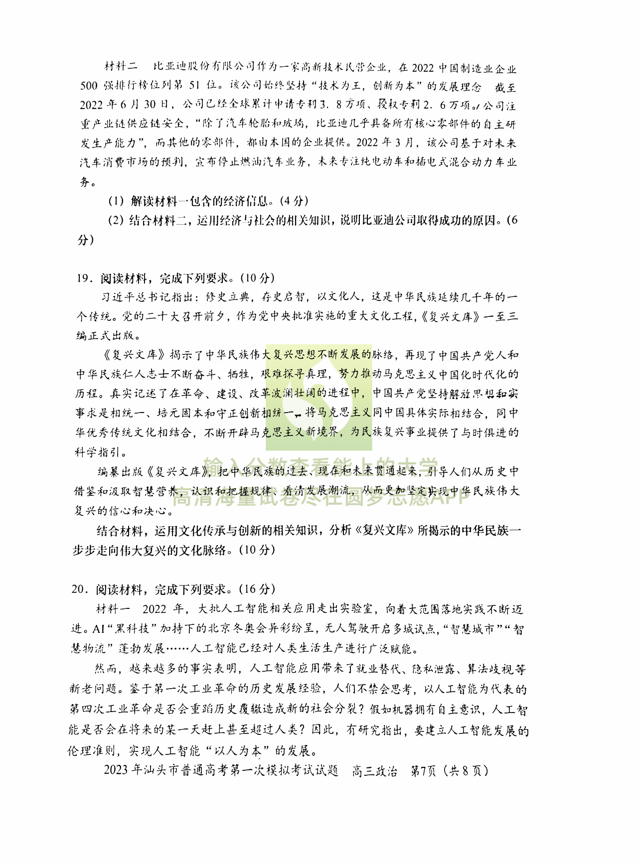 七.2023汕头一模政治试卷真题及答案解析汇总