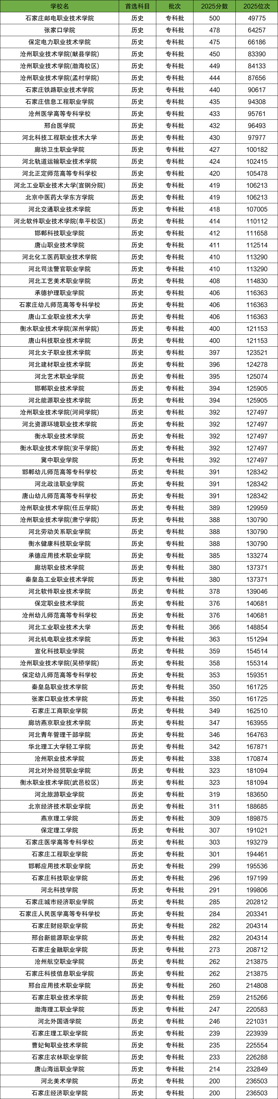 对于高考成绩在本科线以下的河北历史类的同学来说,省内最好考的十所专科学校分别是:邢台应用技术职业学院、石家庄职业技术学院、渤海理工职业学院、河北外国语学院、石家庄理工职业学院、曹妃甸职业技术学院、石家庄农林职业学院、唐山海运职业学院、河北美术学院、石家庄经济职业学院。