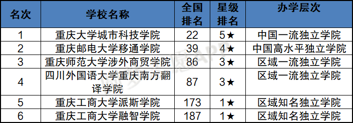 根据校友会2020重庆市独立学院排名,重庆独立学院具体排名情况如下: