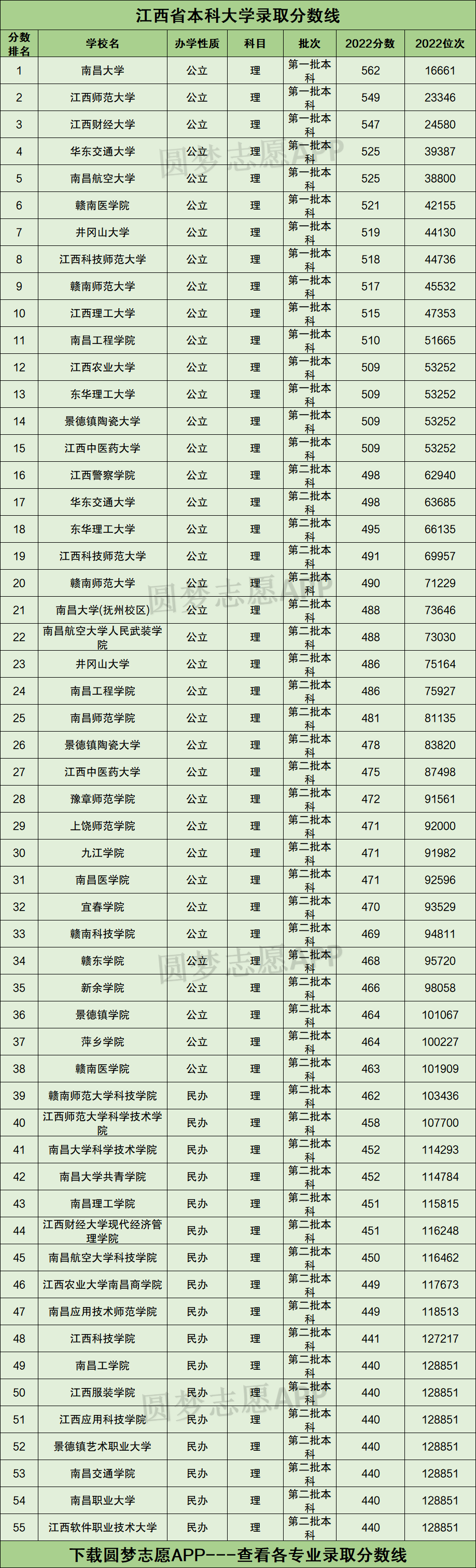 圆梦志愿根据考试院的数据,为大家整理了江西省内所有本科大学2022年高考理科的分数线及位次排名。具体见下图: