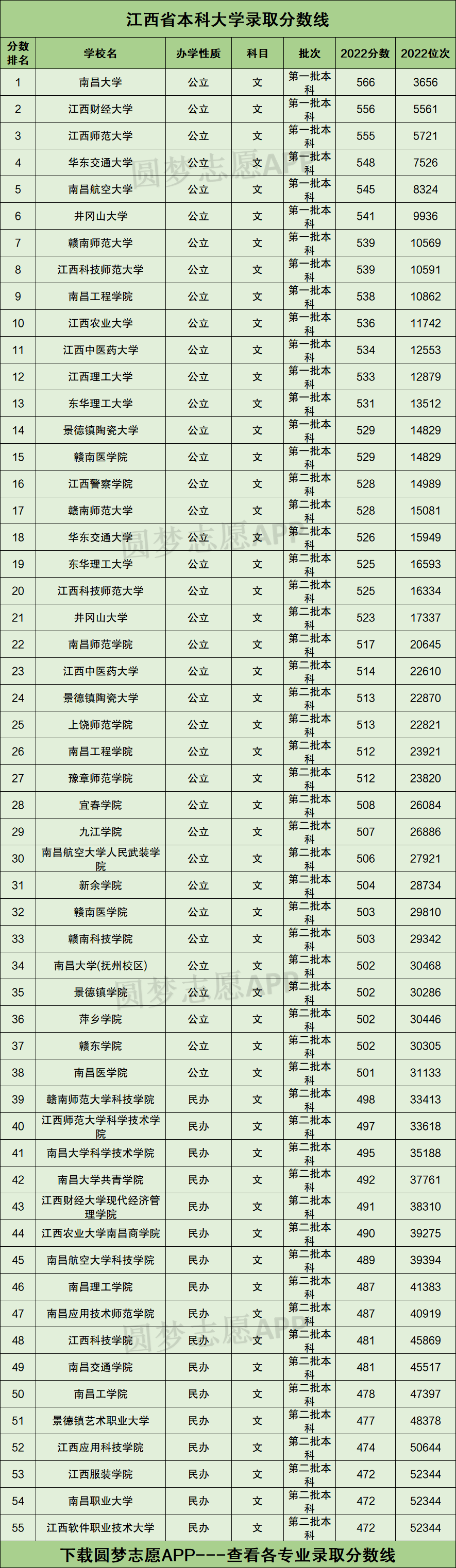 根据江西省考试院公布的数据,圆梦志愿按照文科分数线的高低排序,为大家整理出了下图这份江西省内的所有本科大学文科录取分数线排名榜单: