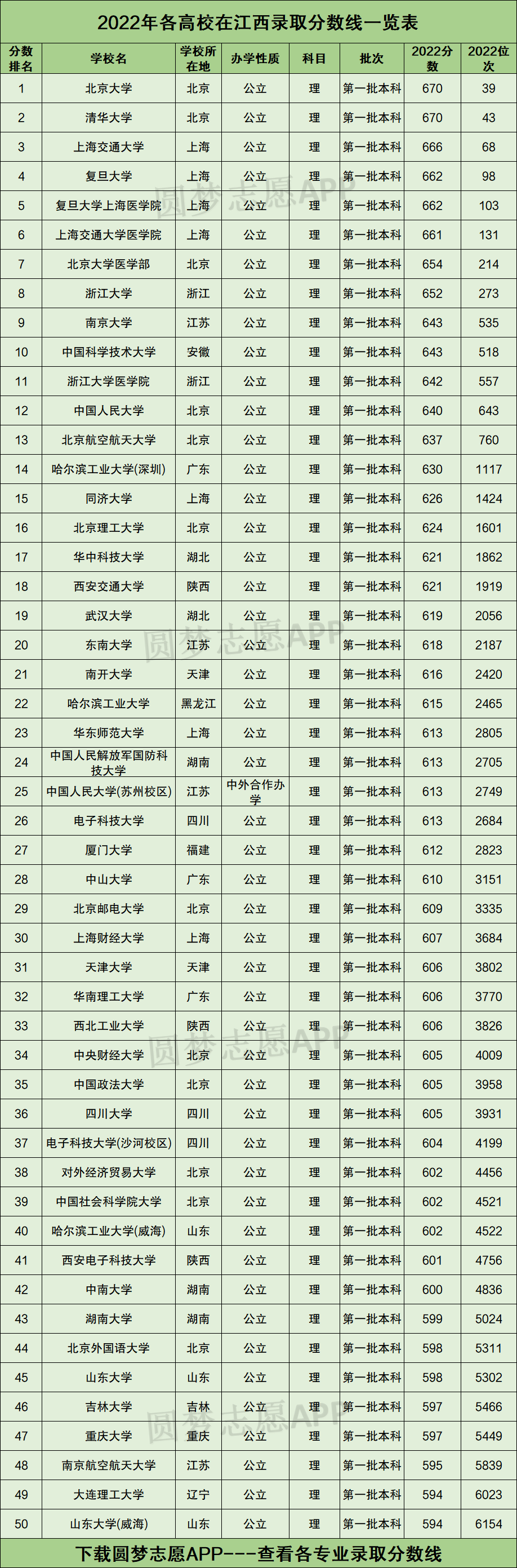 根据上图可知,2022年高考江西理科高三同学,只有成绩在594分以上、排在全省理科考生的前6154名,才有机会被全国前50强大学给录取!