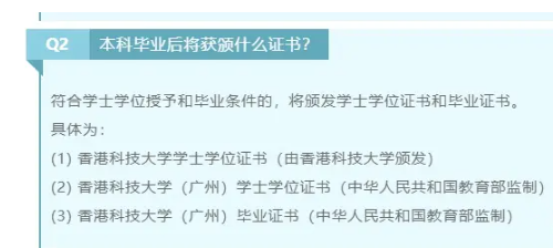 本科学生达到毕业要求后,颁发香港科技大学(广州)毕业证书、学士学位证书及香港科技大学学士学位证书,学历和学位都是受到教育部认可的。