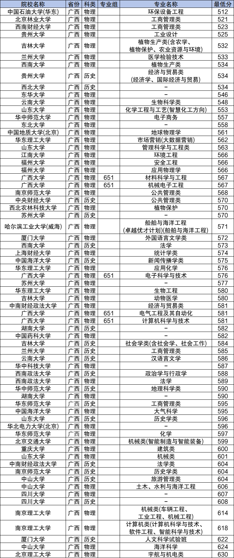 以广西大学为例,物理类各个专业最低分数线如下: