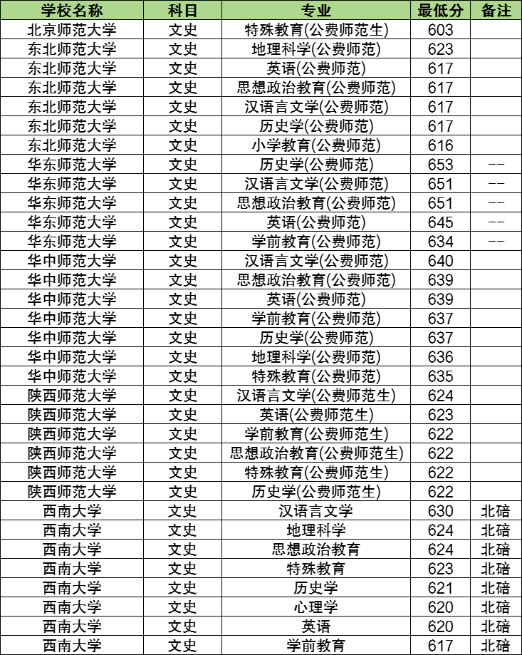 其中在文科中收分最高的大学为华东师范大学,至少要634分;收分最低的公费师范院校为北京师范大学,至少要603分。