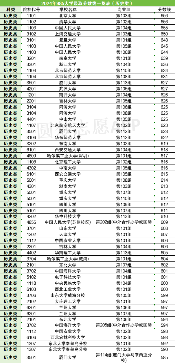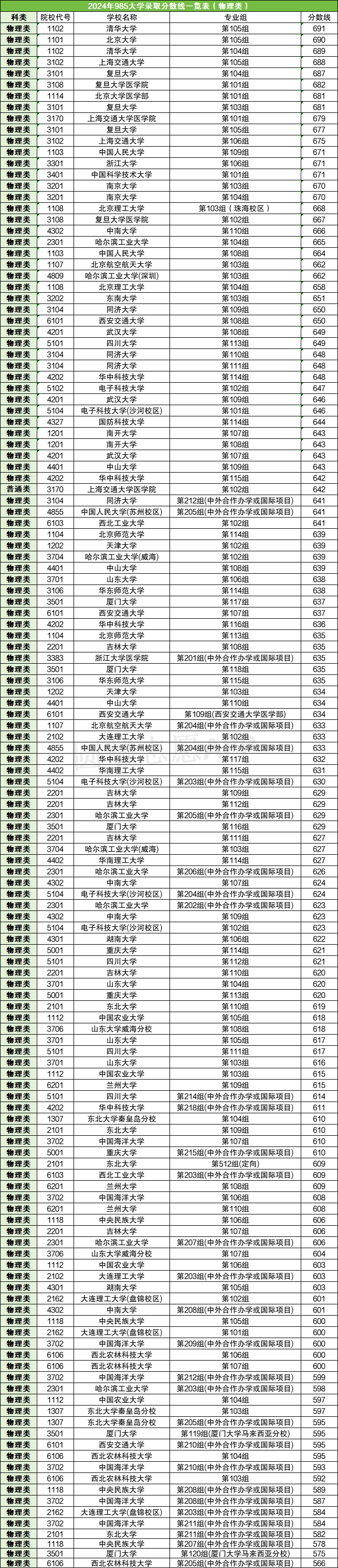 以下是2024年985院校在湖南物理类和历史类的分数线: