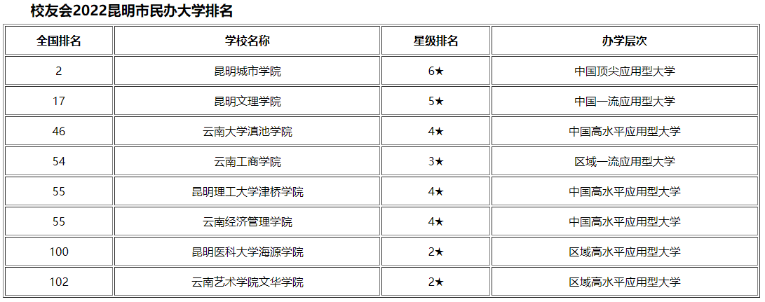 根据校友会2022年昆明市民办大学排名可知,昆明市最好的八所民办大学及全国排名如下。