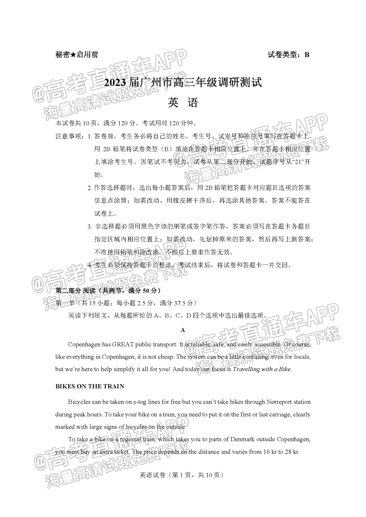 2023广州高三12月调研将于12月19日开考,此次考试的科目一共有十门,即语文、数学、英语、物理、化学、生物、政治、历史、地理、日语。以下是英语的试卷及答案详情,详情如下: