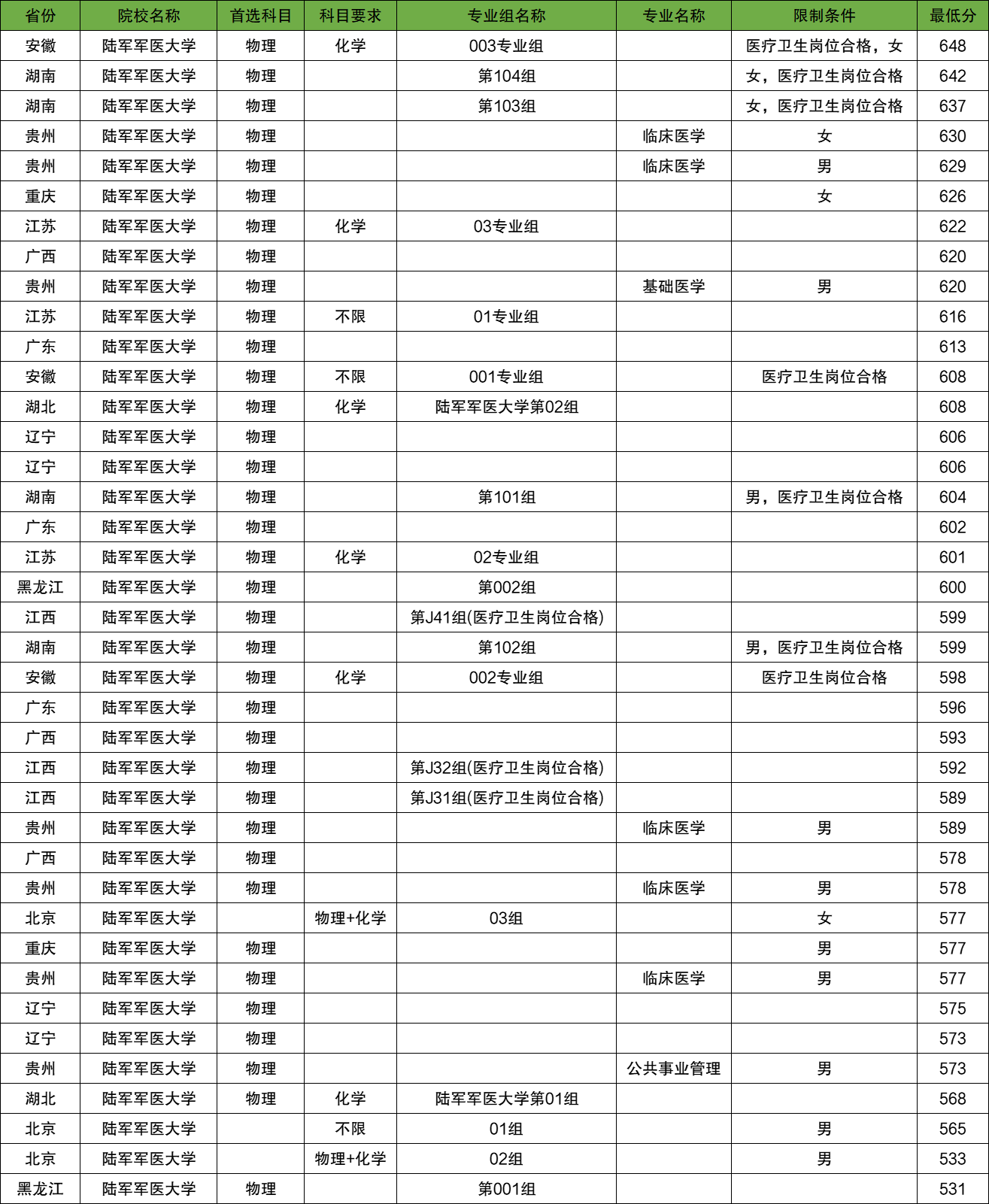 2025年陆军军医大学提前批录取分数线是531分到648分,录取最低在黑龙江物理类、录取最高在安徽物理类。