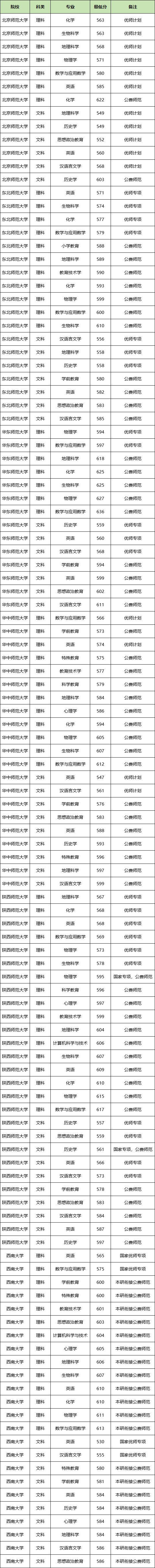 2、国家公费师范生院校:北京师范大学、东北师范大学、华中师范大学、西南大学、陕西师范大学、华东师范大学。