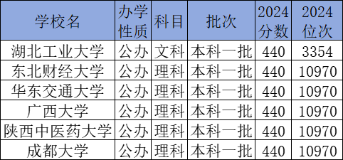文科440分能上的大学有湖北工业大学;理科440分能上的大学有东北财经大学、华东交通大学、广西大学等。