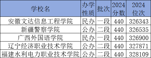 440分能上的大学中公办的有新疆警察学院、辽宁经济职业技术学院、福建水利电力职业技术学院,民办的有安徽文达信息工程学院、广西外国语学院。