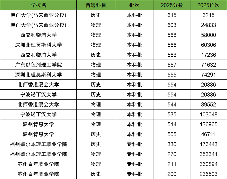 厦门大学(马来西亚分校),其中首选历史615分、首选物理603分。