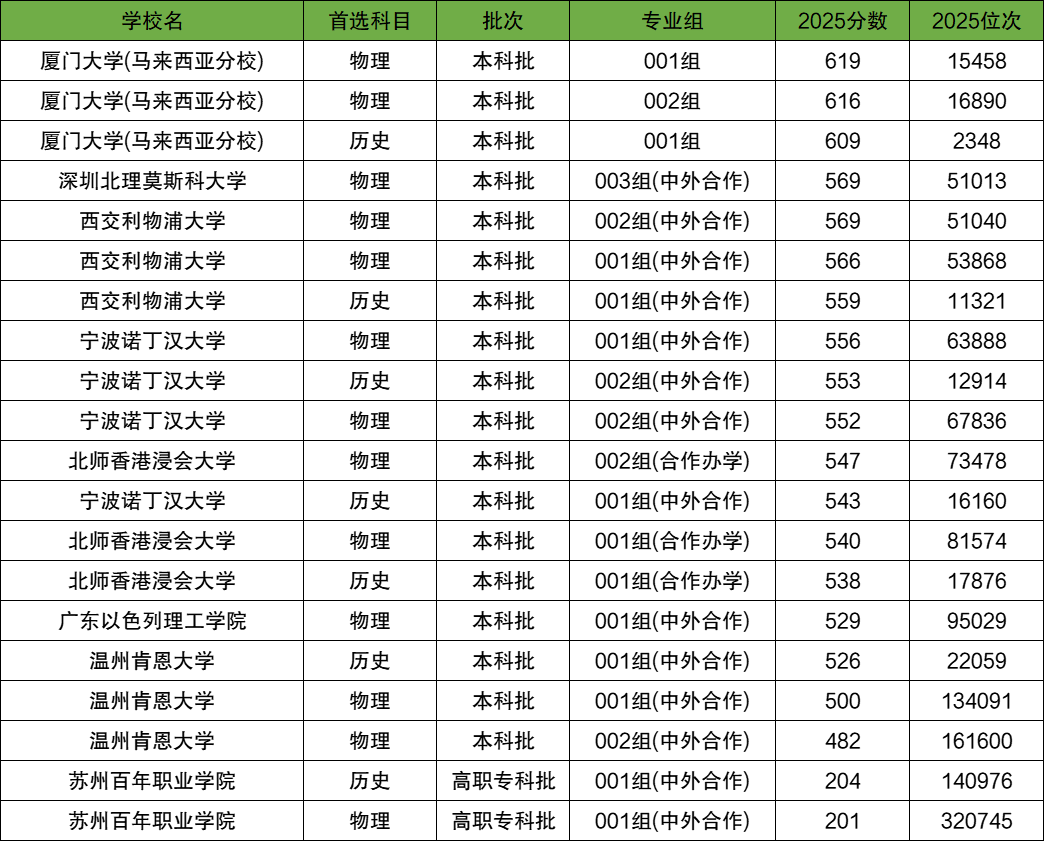 接下来我们就一起来看看安徽省、河北省2025年中外合办大学的录取分数线排名情况,其中包括中外合作办学机构,如广东以色列理工学院、温州肯恩大学等,此外还包括中外合办项目,如各院校的中外合办专业。