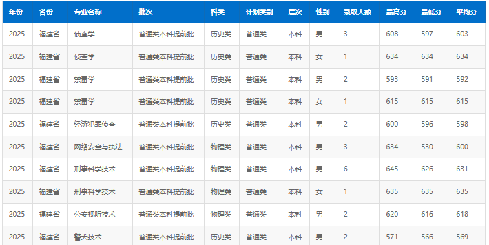 2025年中国刑事警察学院在福建录取最低分:历史类566分、物理类530分。其中历史类男生最低566分(警犬技术)、女生最低615分(禁毒学);物理类男生最低530分(网络安全与执法)、女生最低635分(刑事科学技术)。
