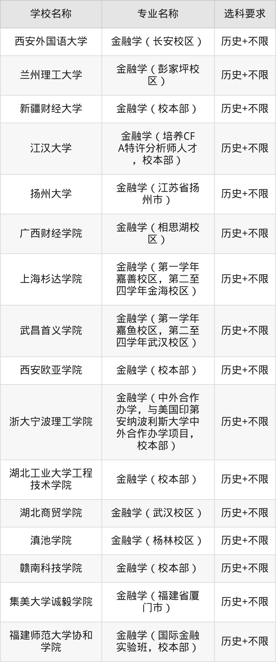| 江西财经大学 | 金融学(培养CF A(特许金融分析 师)人才,校本部) | 物理+不限 |