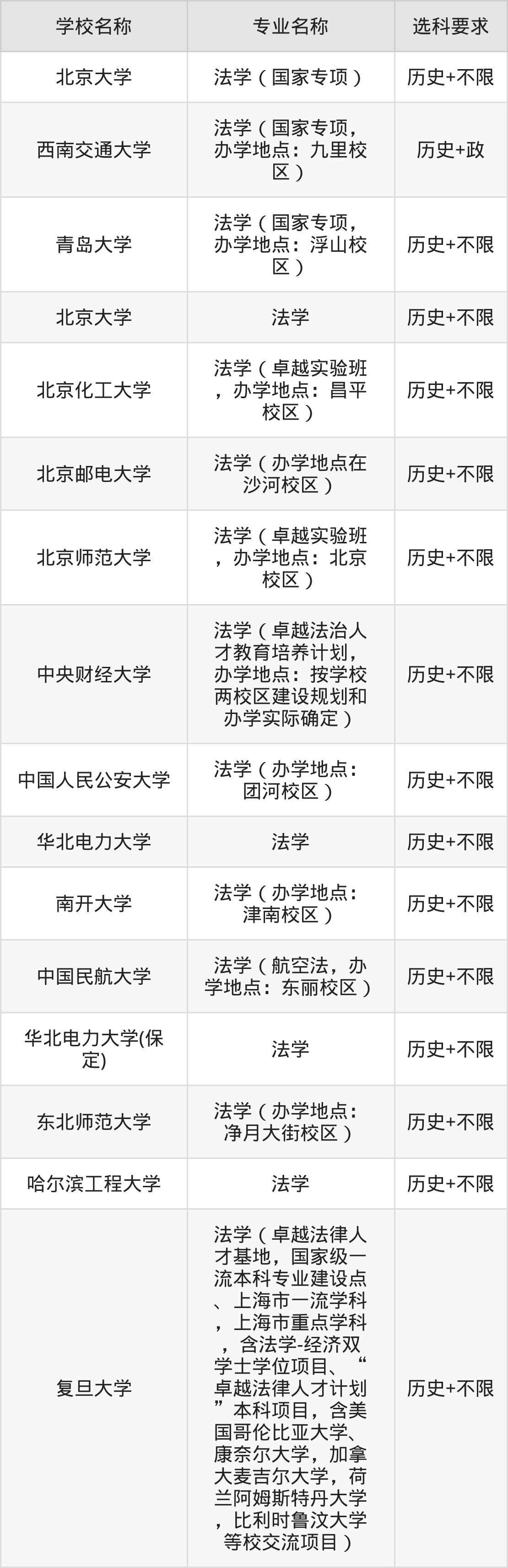 | 华东政法大学 | 法学(网络与信息 法,办学地点:松 江校区) | 物理+不限 |