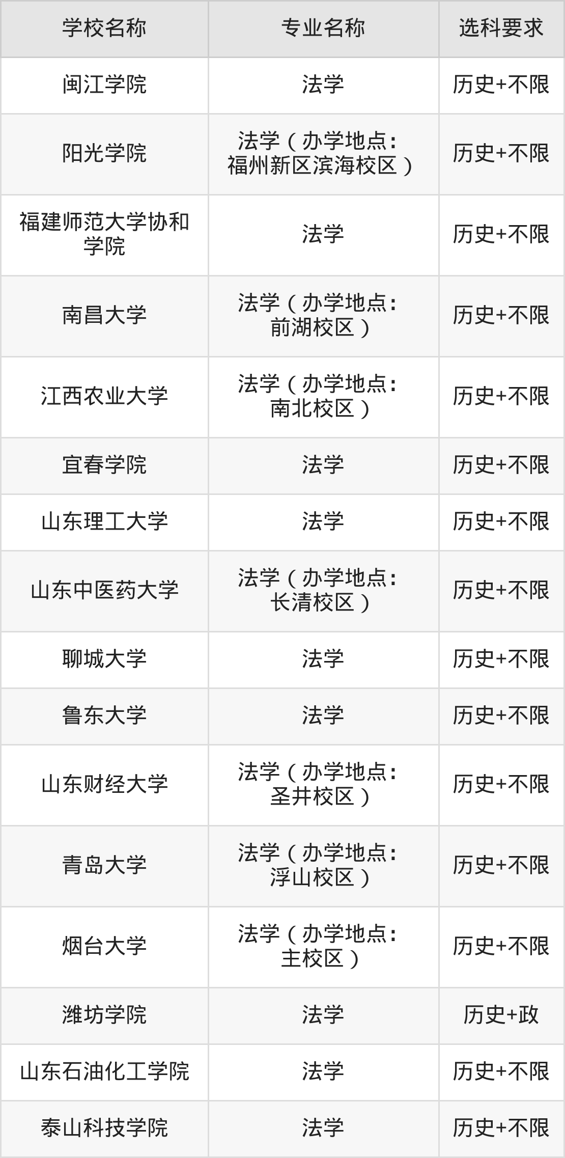 | 齐鲁工业大学 | 法学(第一学年历 城校区就读,第二 至四学年长清校区 就读) | 物理+不限 |