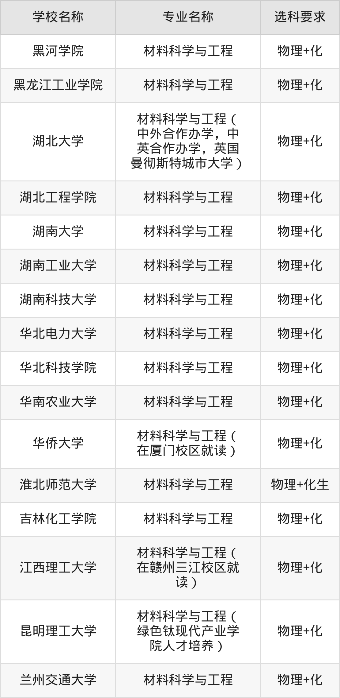 以河北高考最新招生计划为例进行统计,在不可报的学校中,有99.02%的本科大学的材料科学与工程专业招生时,要求考生必选“物理+化”,有0.98%的本科大学的材料科学与工程专业招生时,要求考生必选“物理+化生”。
