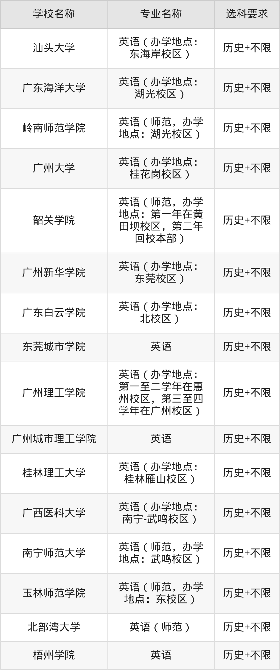 | 广东外语外贸大学 | 英语(办学地点: 白云山校区,培养 英语国家文学与文 化、语言与心理科 学、翻译与国际传 播、语言信息技术 人才) | 物理+不限 |