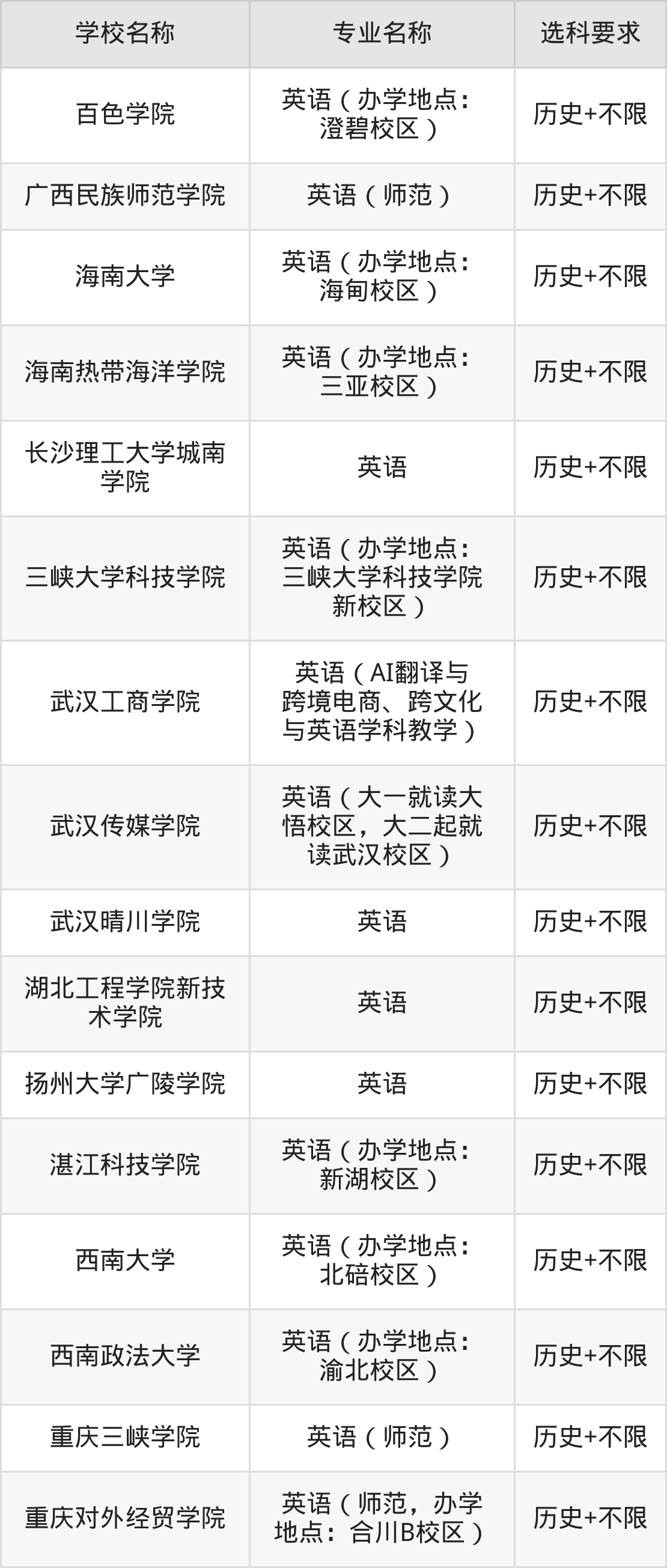 | 海口经济学院 | 英语(教育、翻译 、商务方向) | 物理+不限 |