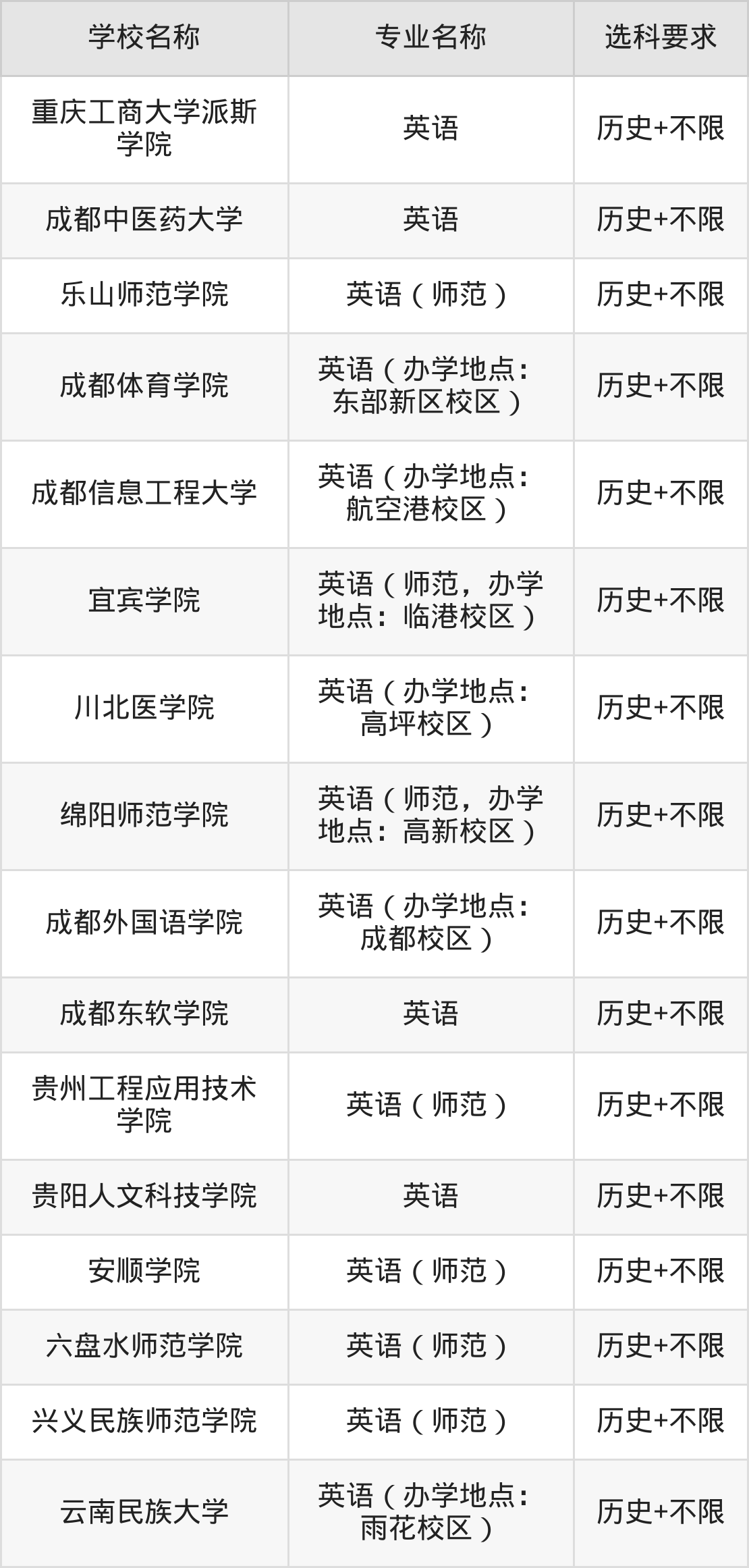 | 四川外国语大学 | 英语(教育学双学 位,英语+教育学 双学位专业,详情 请查看招生章程) | 物理+不限 |