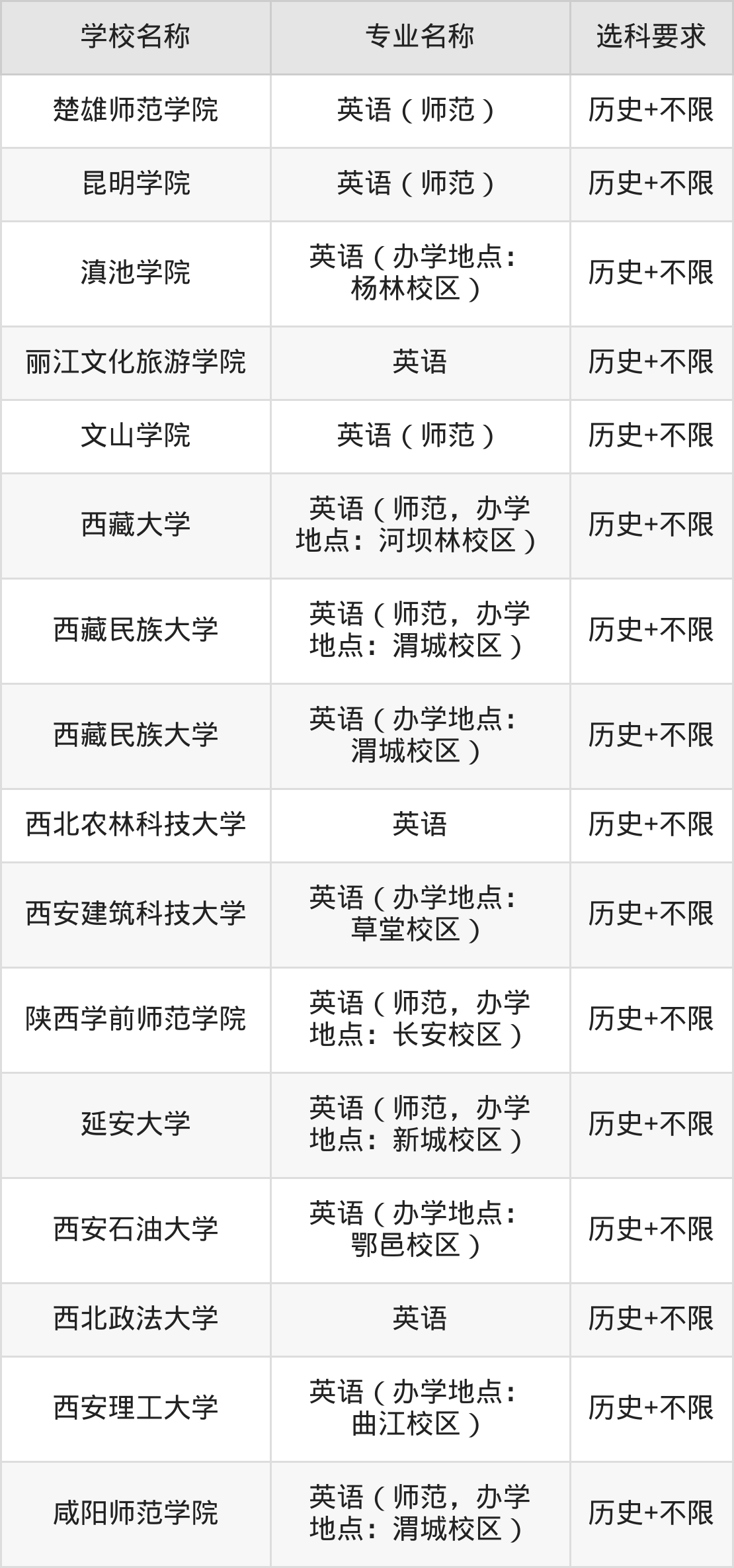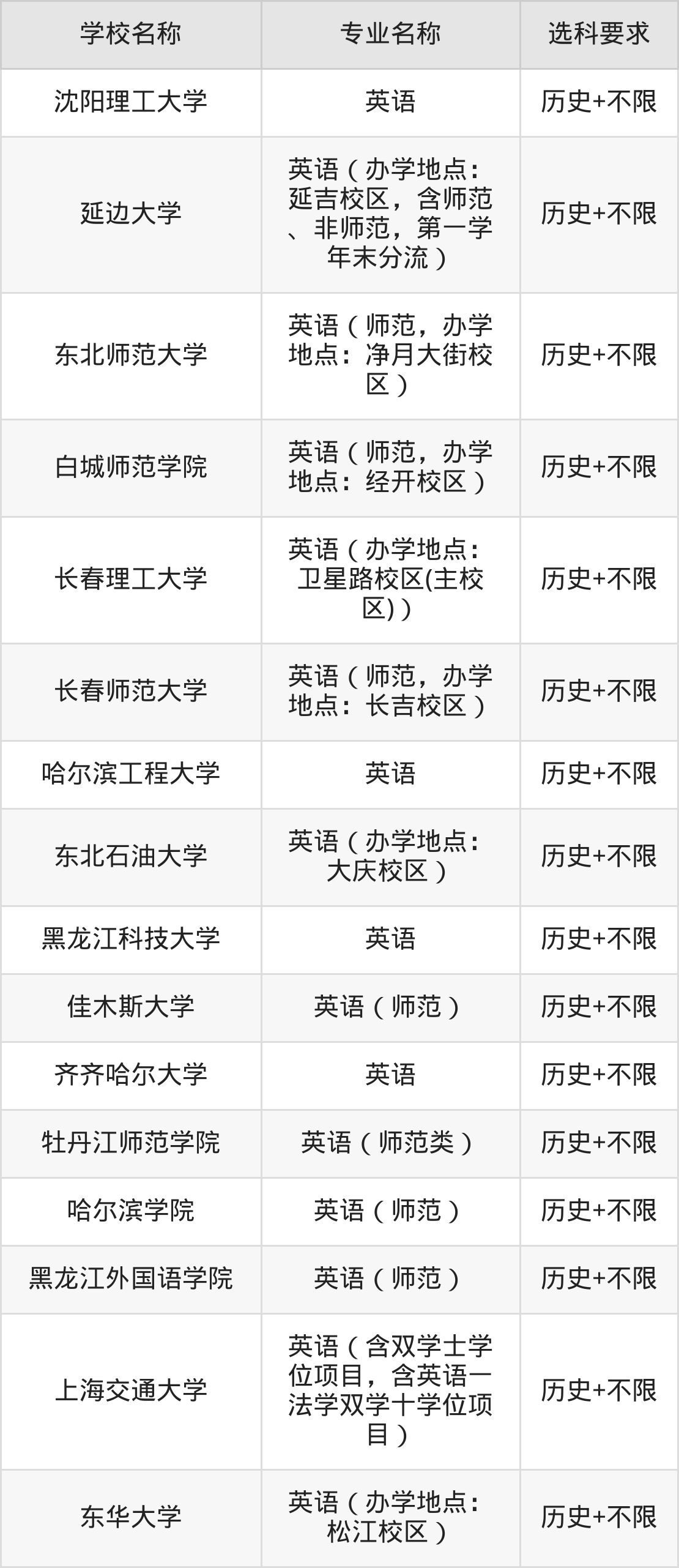 | 吉林外国语大学 | 英语 | 物理+不限 |