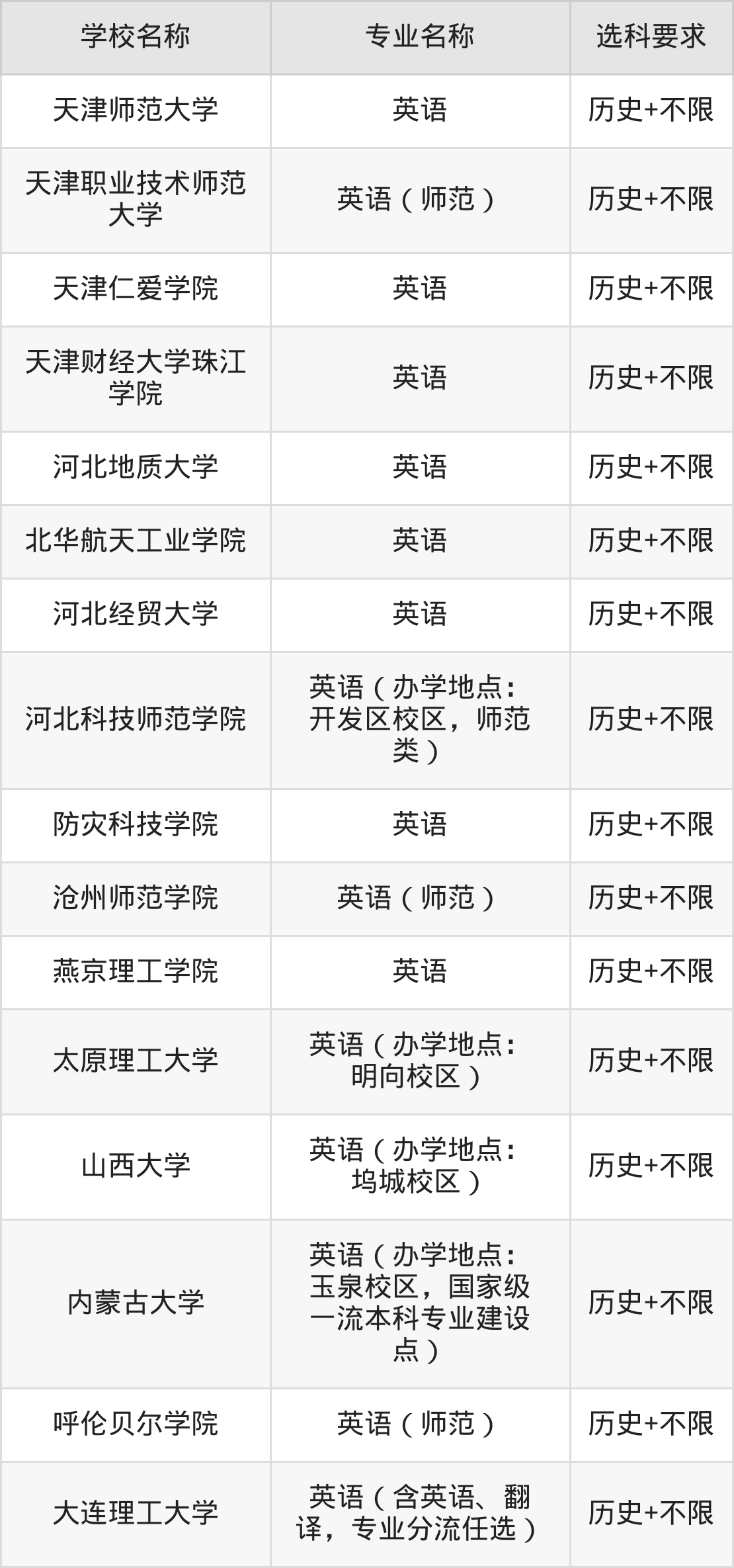 | 河北外国语学院 | 英语 | 物理+不限 |