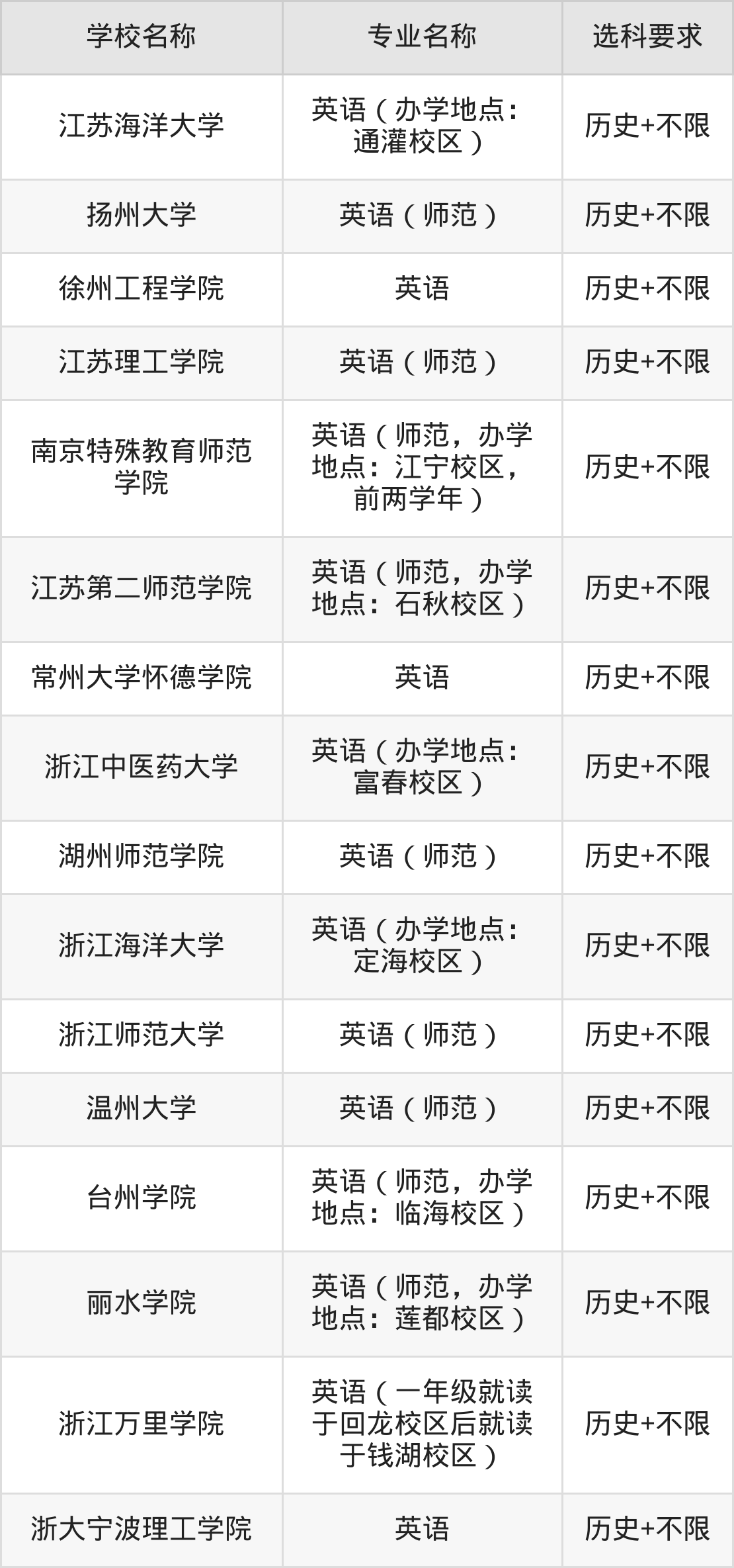 | 浙江外国语学院 | 英语(师范) | 物理+不限 |
