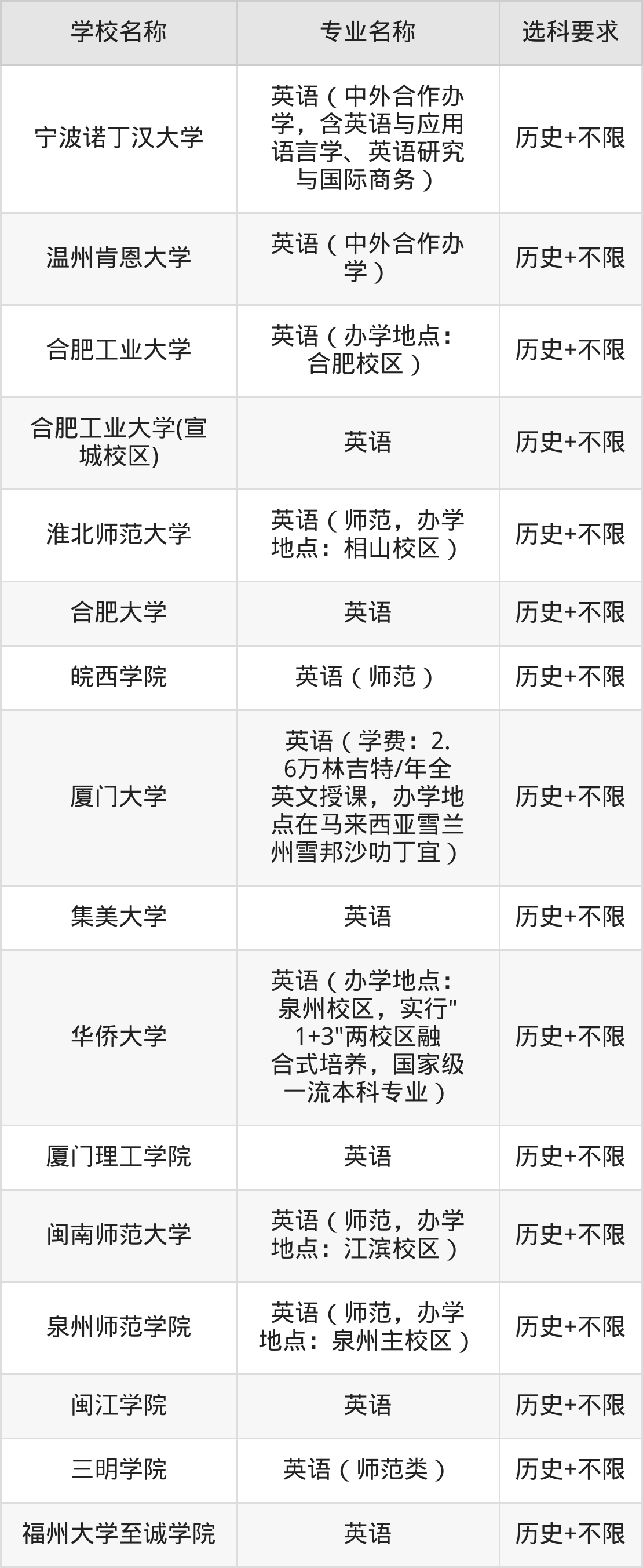 | 福建师范大学协和 学院 | 英语 | 物理+不限 |