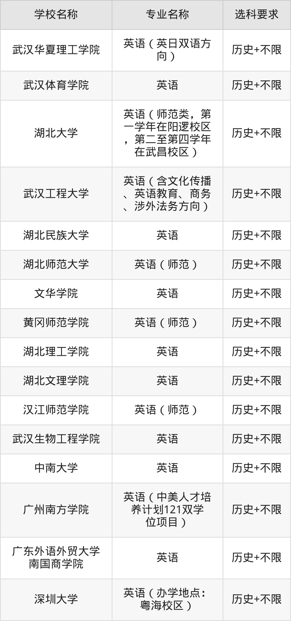 | 湖北大学知行学院 | 英语(教育、翻译 方向) | 物理+不限 |