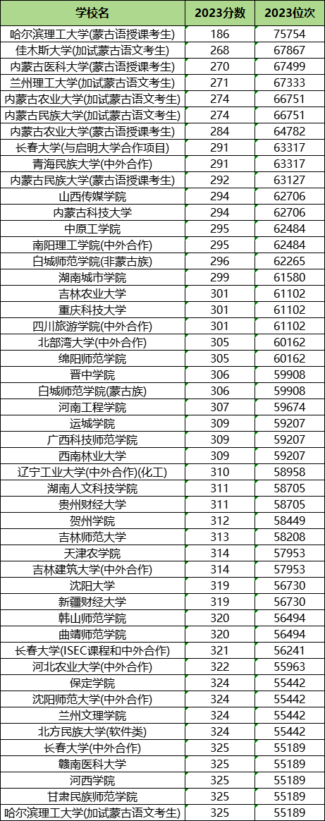 最好考、收分最低的公办二本大学有长春大学(与启明大学合作项目)、青海民族大学(中外合作)、山西传媒学院、内蒙古科技大学,这些学校中2023理科最低投档分为291分,比吉林二本线低1分录取,考生可捡漏。