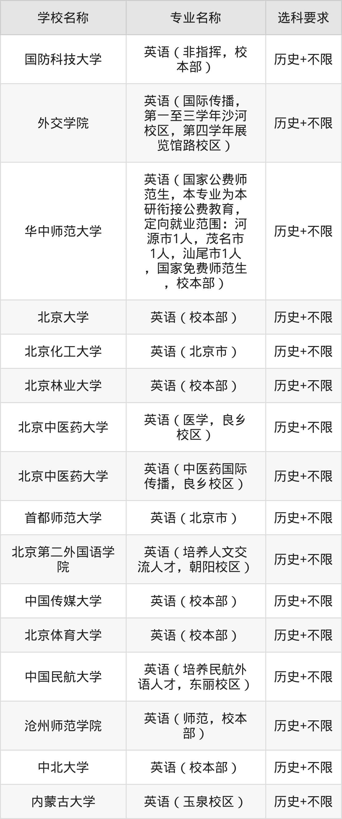 | 北京大学医学部 | 英语(培养医学英 语人才,校本部) | 物理+不限 |
