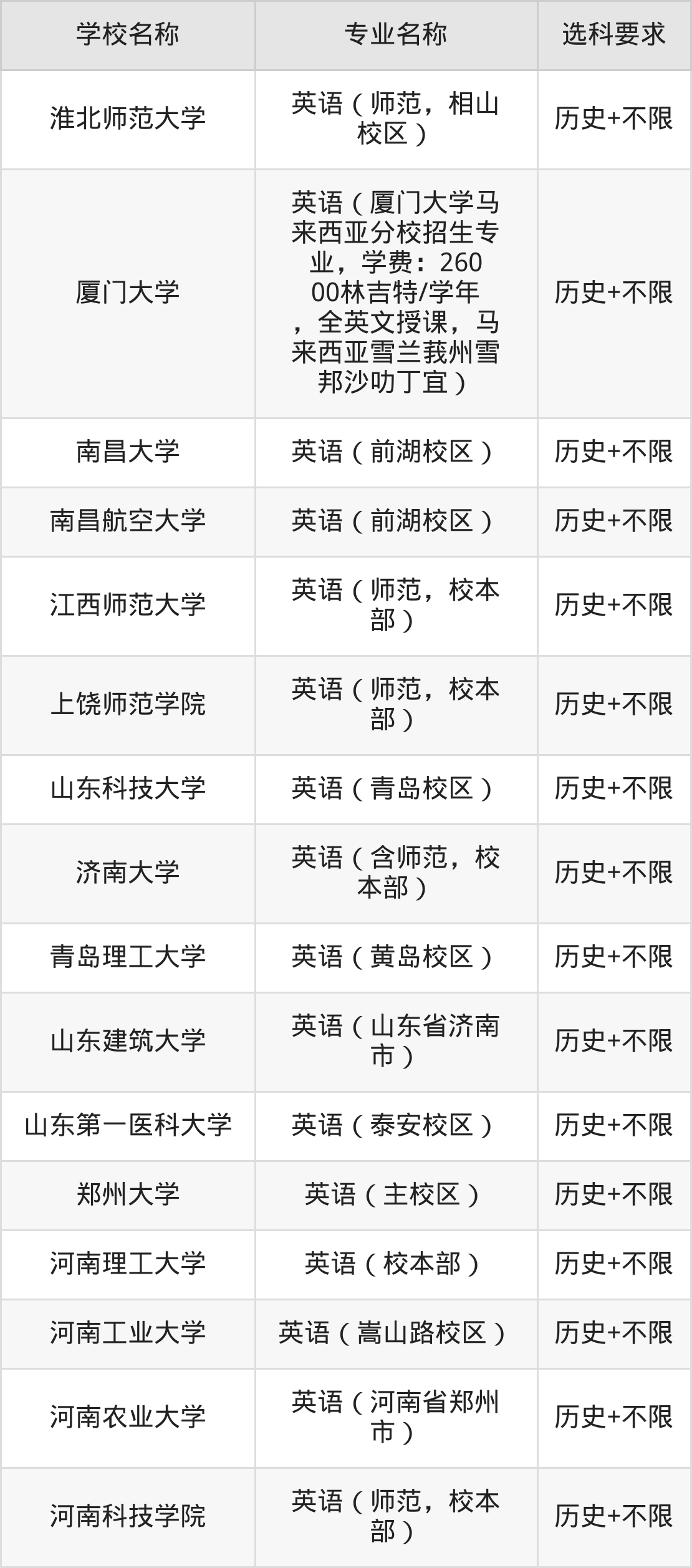 | 河南大学 | 英语(师范,开封 校区) | 物理+不限 |