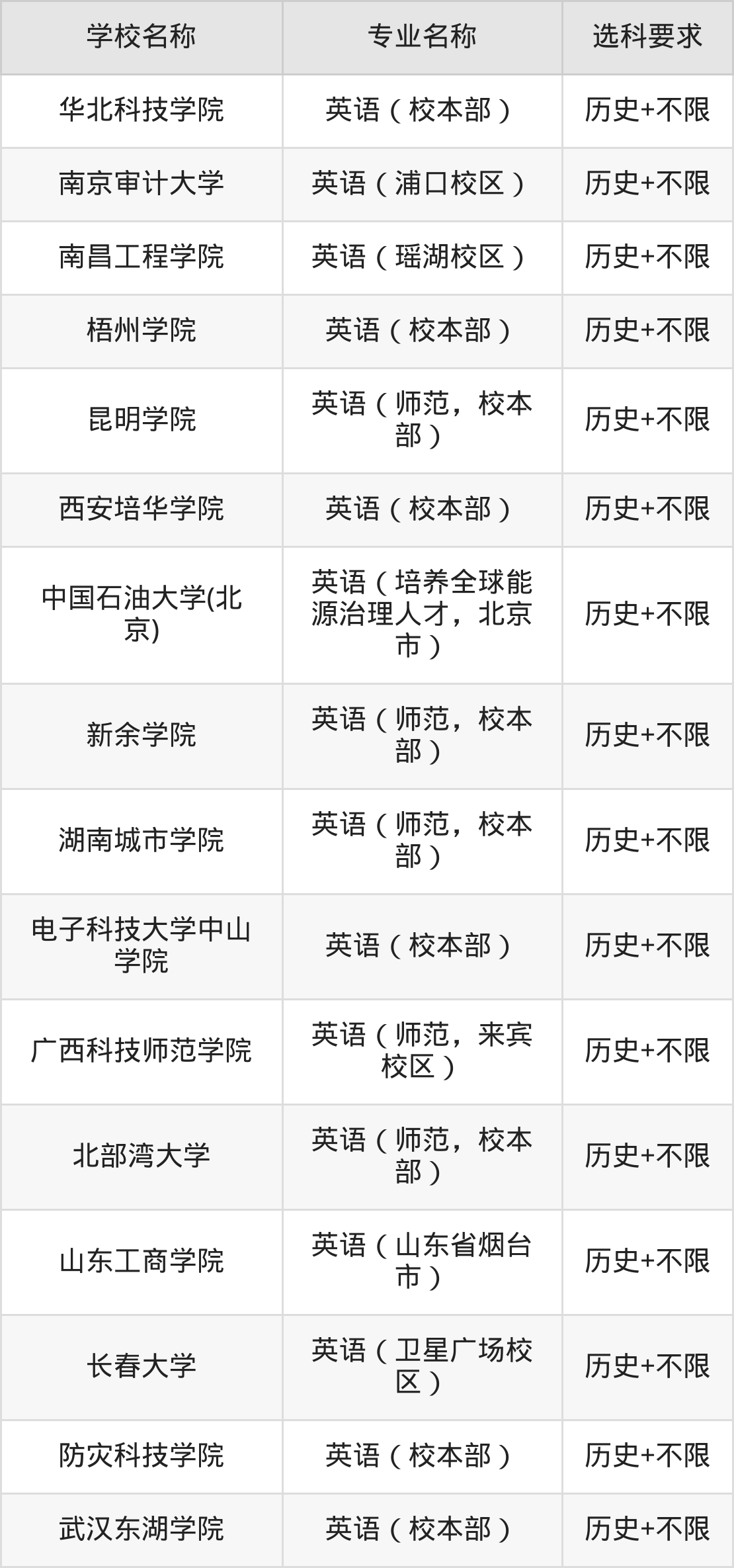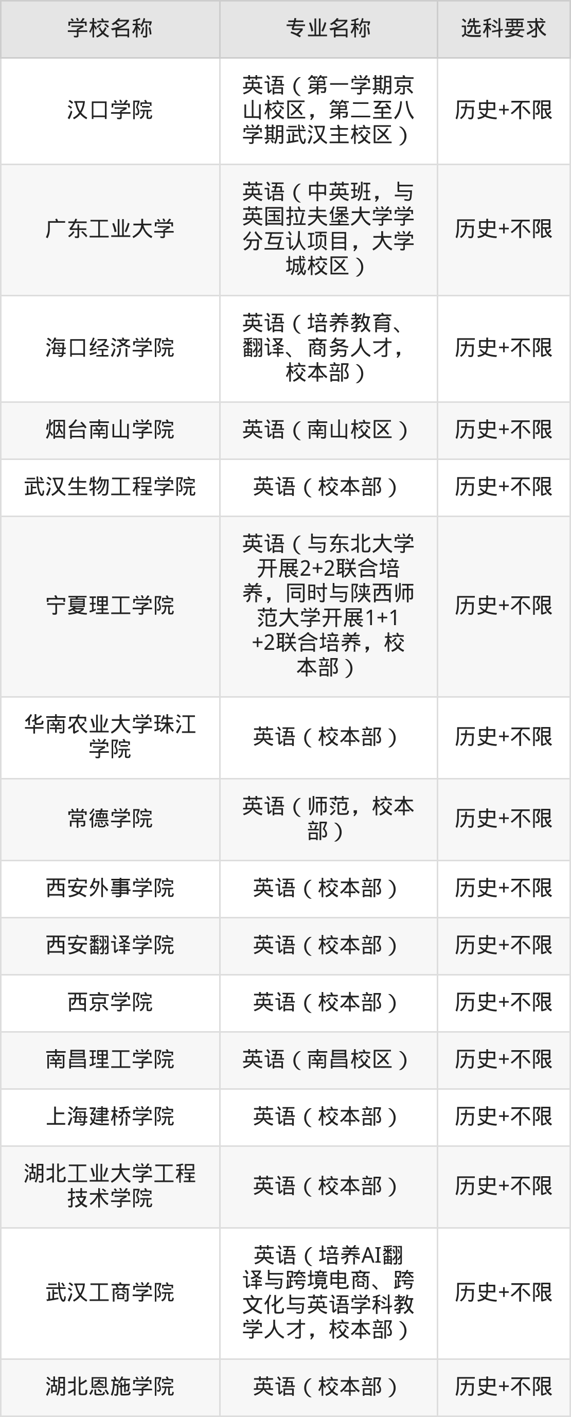 | 武汉城市学院 | 英语(第一学年红 安校区,第二至四 学年武汉主校区) | 物理+不限 |