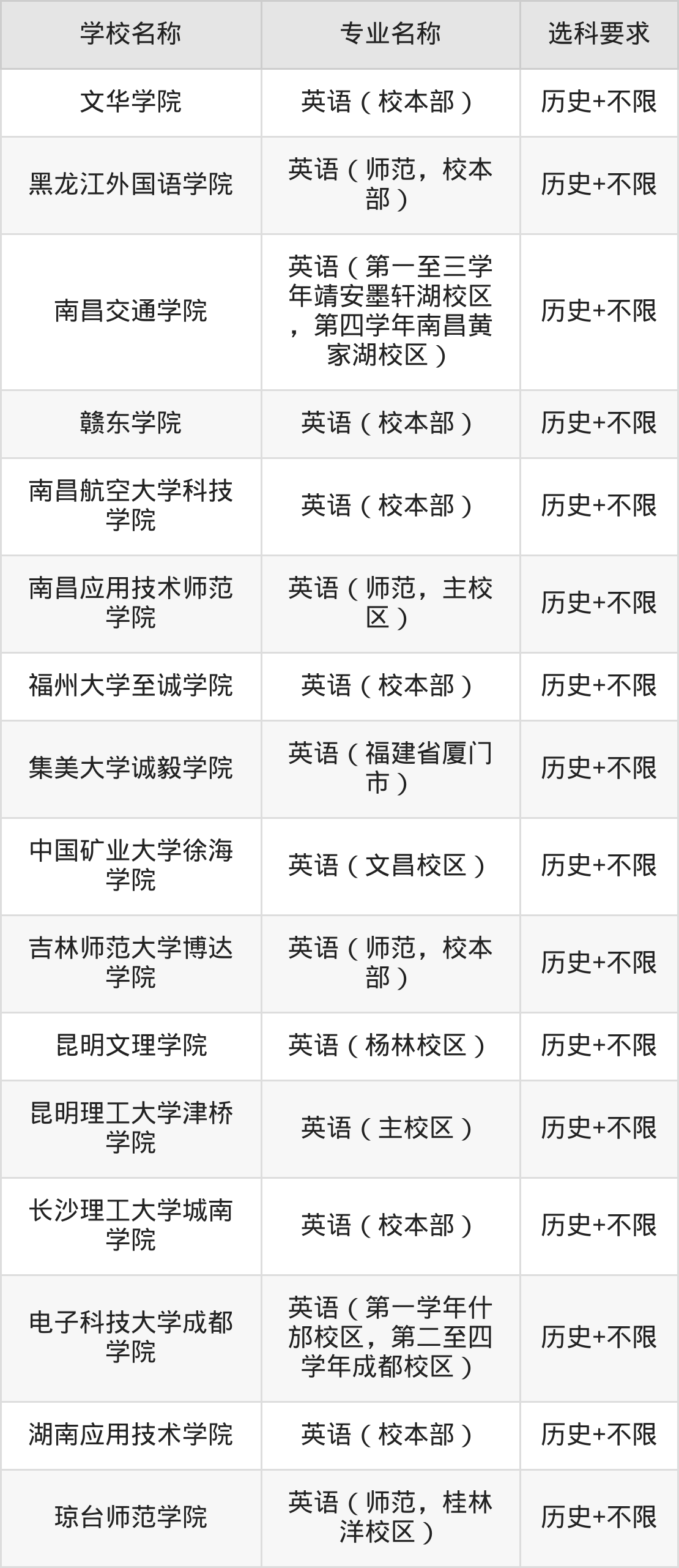| 吉林外国语大学 | 英语(英法双语, 法语零起点,校本 部) | 物理+不限 |