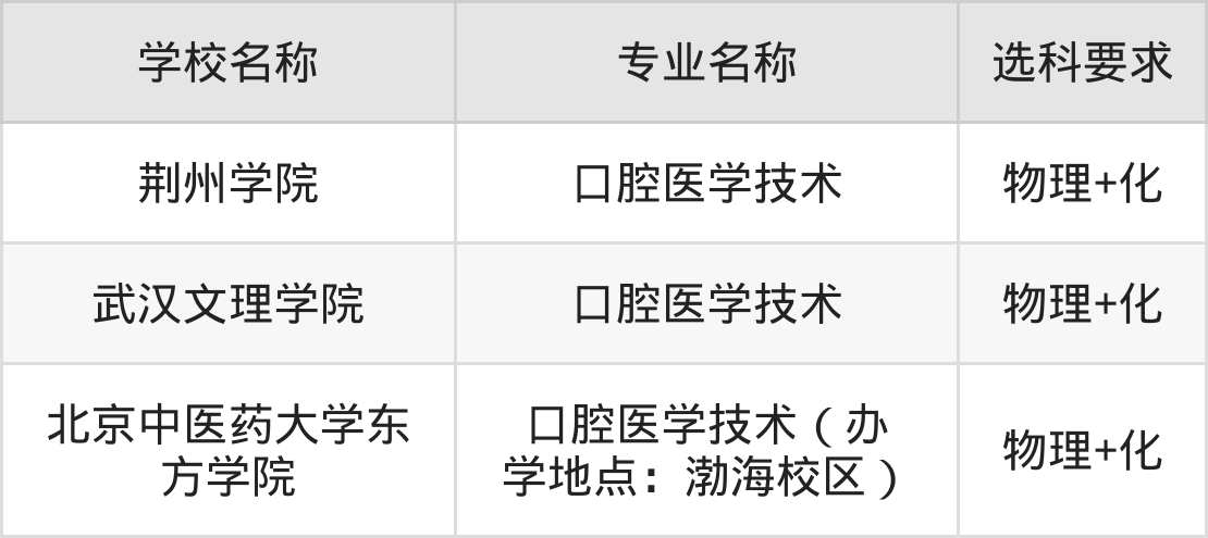 物生政组合的考生不符合这部分学校的选科要求,所以不可以报考这些学校的口腔医学技术专业。比如:荆州学院、武汉文理学院、北京中医药大学东方学院等。