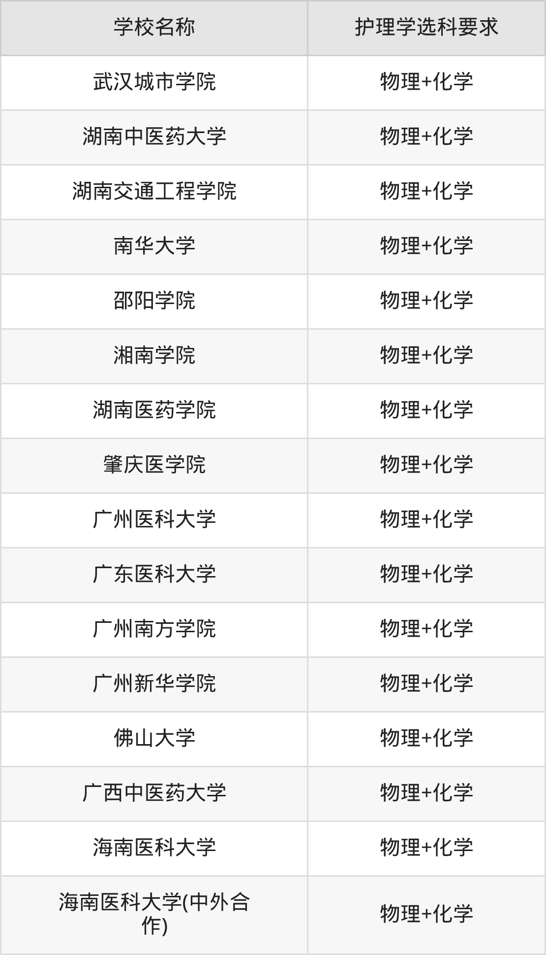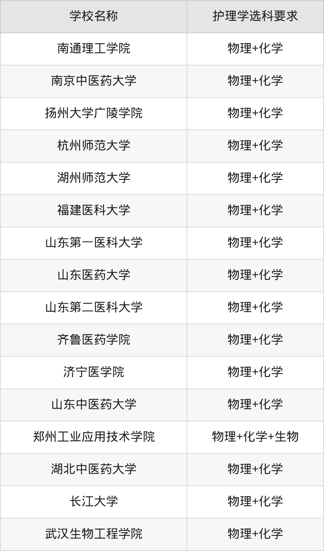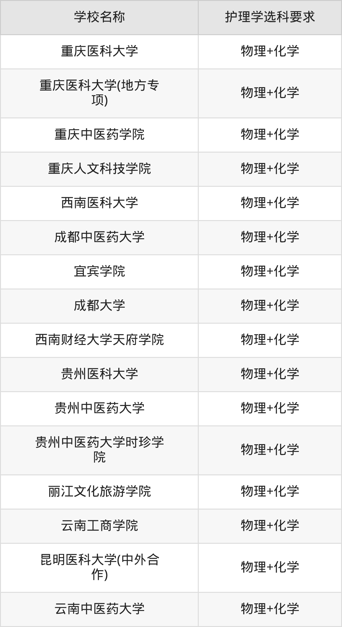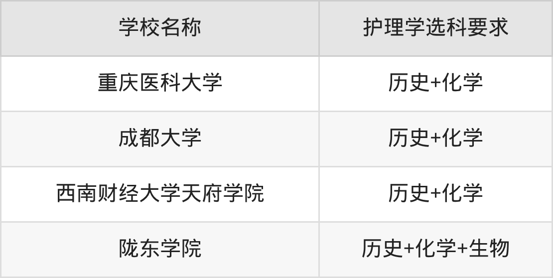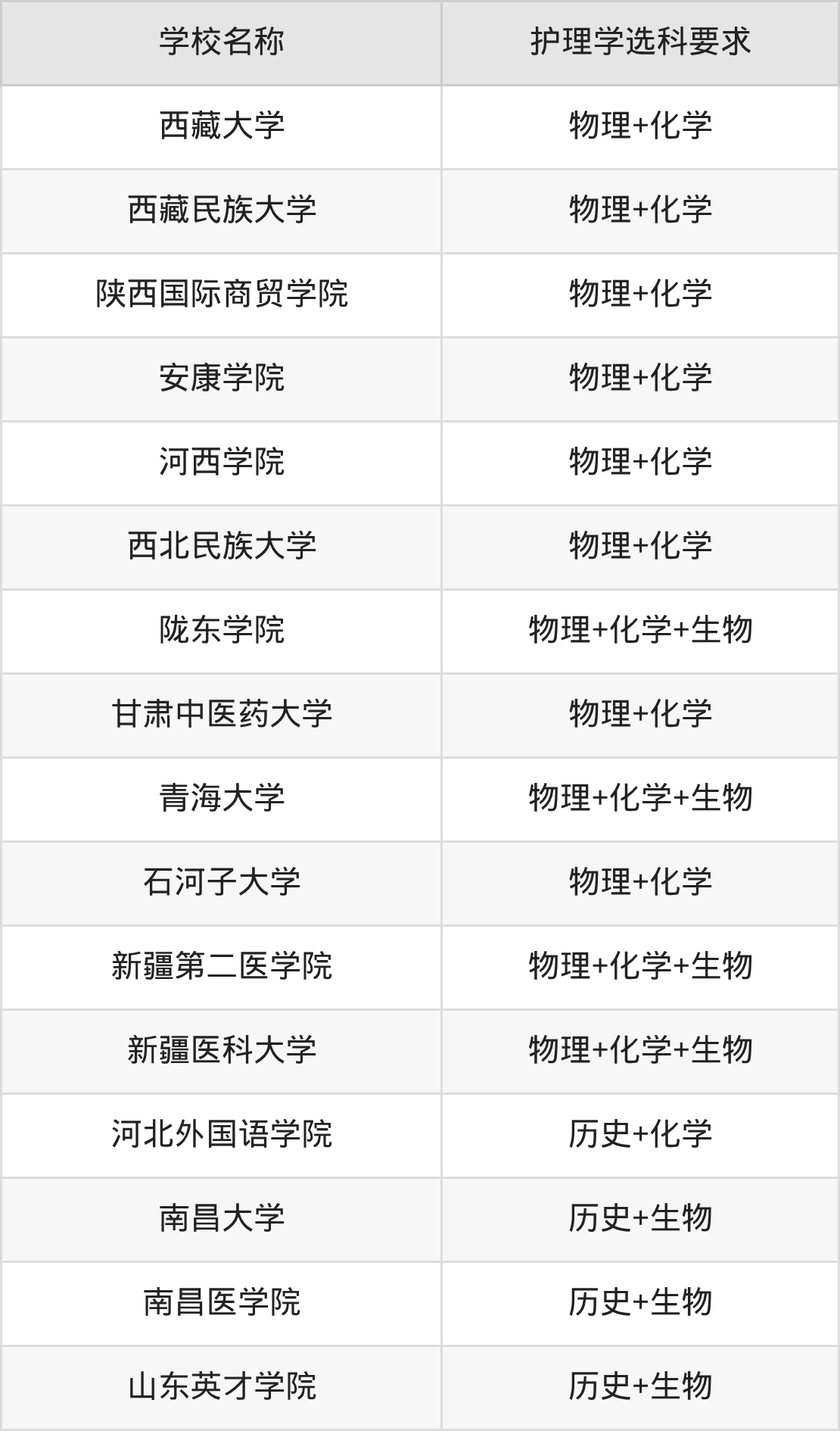 以重庆高考最新招生计划为例进行统计,在不可报的学校中,有71所本科大学的护理学专业招生时,要求考生必选“物理+化学”,有5所本科大学的护理学专业招生时,要求考生必选“物理+化学+生物”,有4所本科大学的护理学专业招生时,要求考生必选“历史+化学”,有3所本科大学的护理学专业招生时,要求考生必选“历史+生物”,有1所本科大学的护理学专业招生时,要求考生必选“历史+化学+生物”。