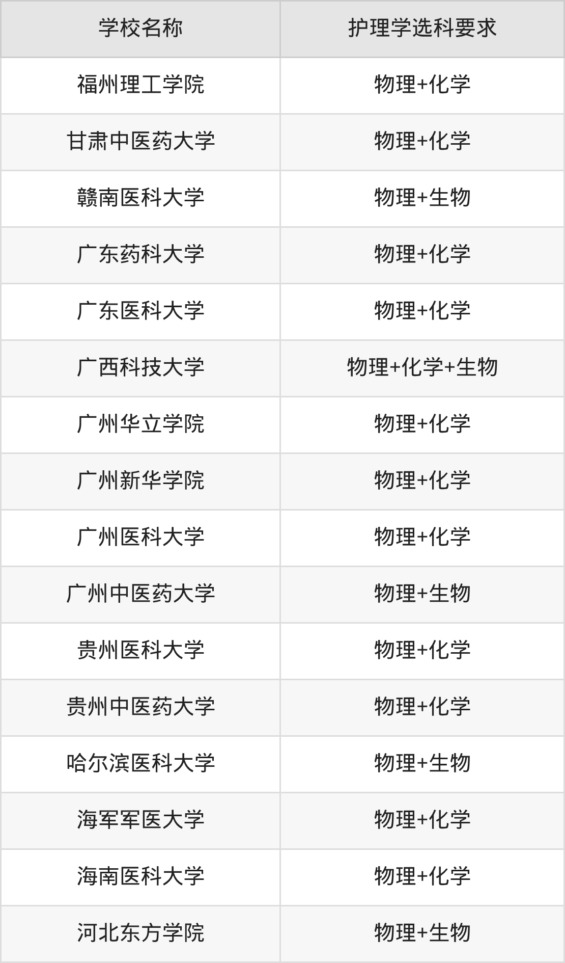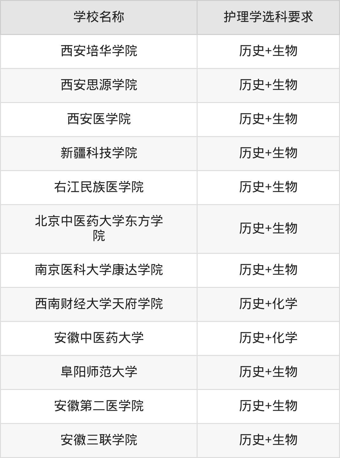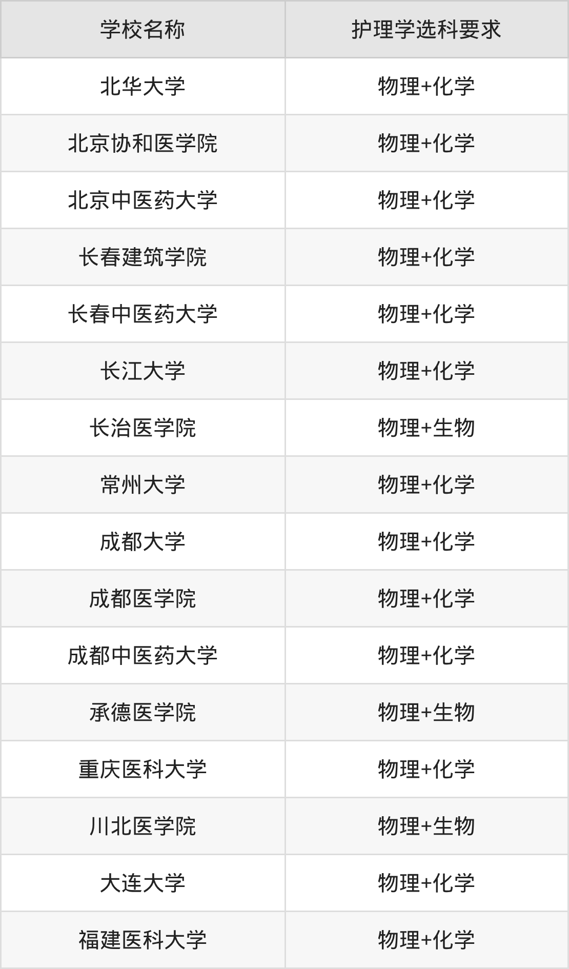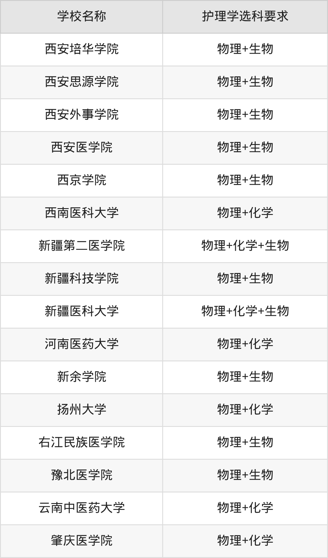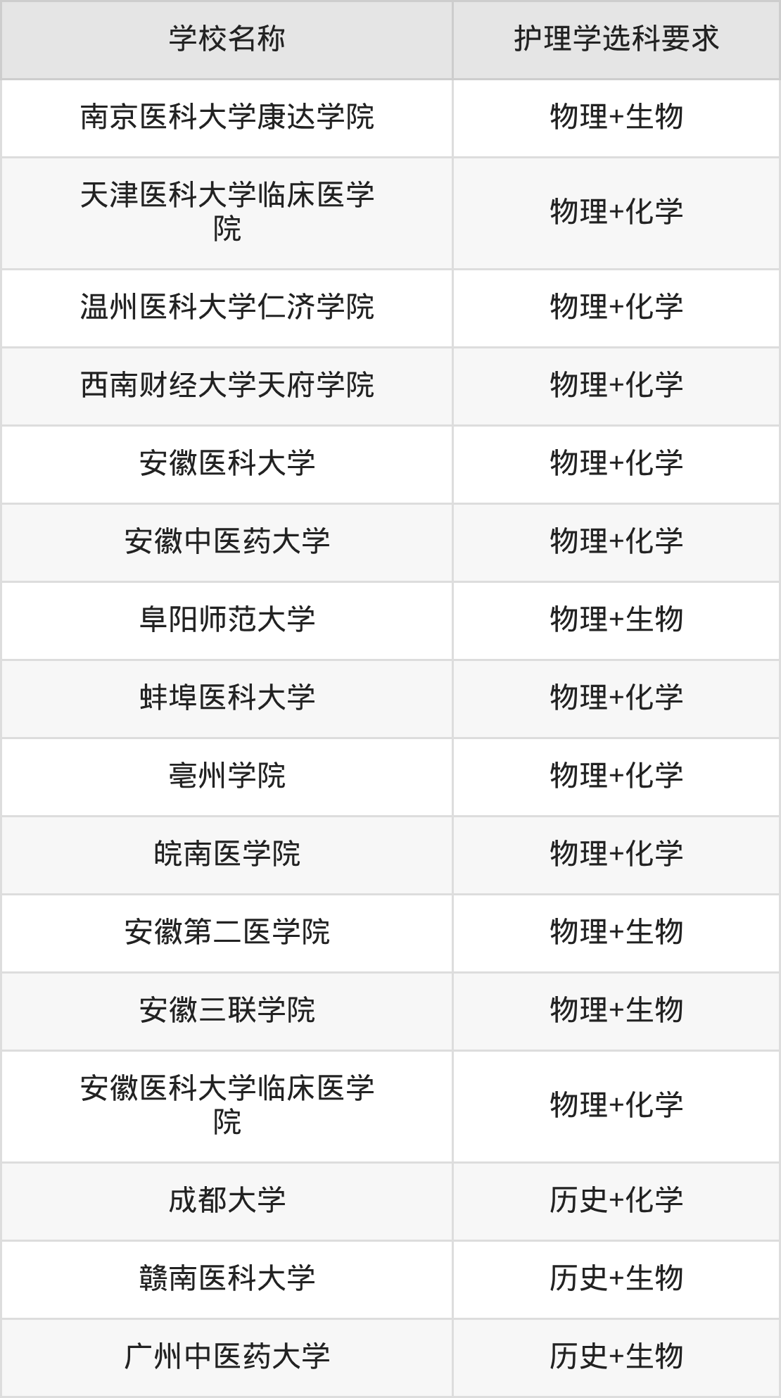 以安徽高考最新招生计划为例进行统计,在不可报的学校中,有92所本科大学的护理学专业招生时,要求考生必选“物理+化学”,有55所本科大学的护理学专业招生时,要求考生必选“物理+生物”,有10所本科大学的护理学专业招生时,要求考生必选“物理+化学+生物”,有4所本科大学的护理学专业招生时,要求考生必选“历史+化学”,有26所本科大学的护理学专业招生时,要求考生必选“历史+生物”,有1所本科大学的护理学专业招生时,要求考生必选“历史+化学+生物”。