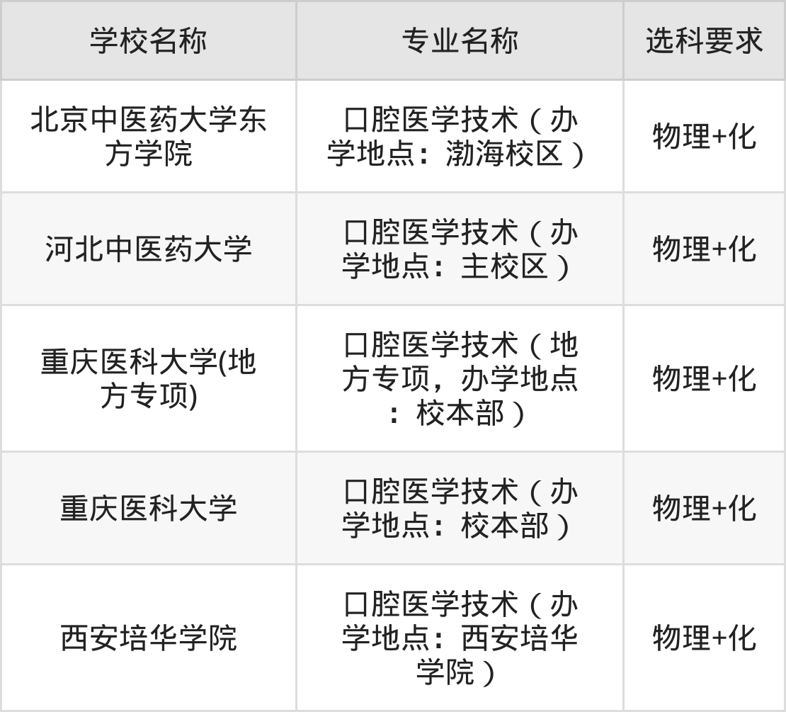 物生地组合的考生不符合这部分学校的选科要求,所以不可以报考这些学校的口腔医学技术专业。比如:北京中医药大学东方学院、河北中医药大学、重庆医科大学(地方专项)、重庆医科大学、西安培华学院等。